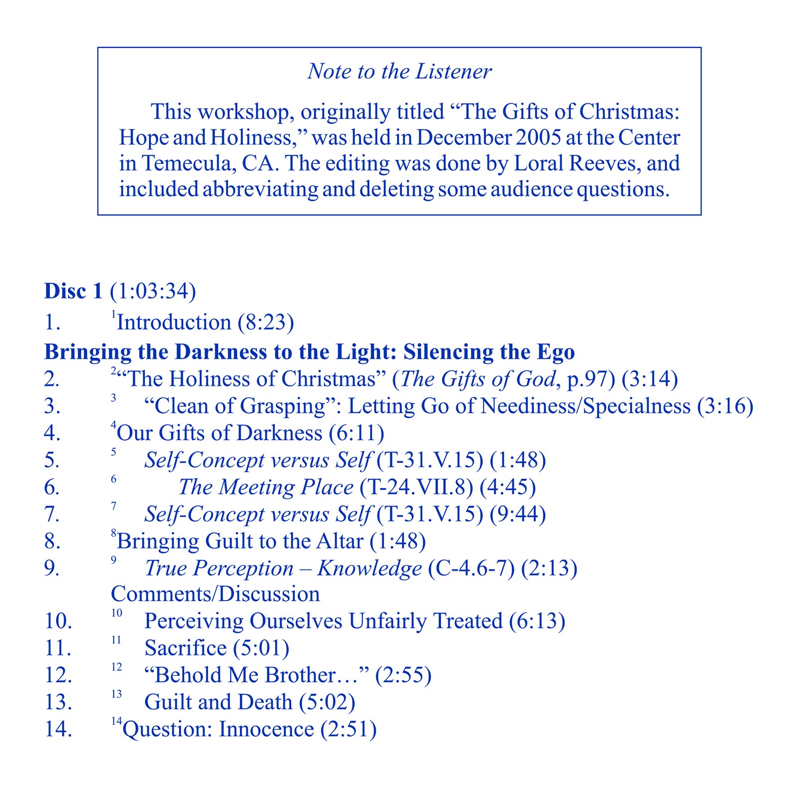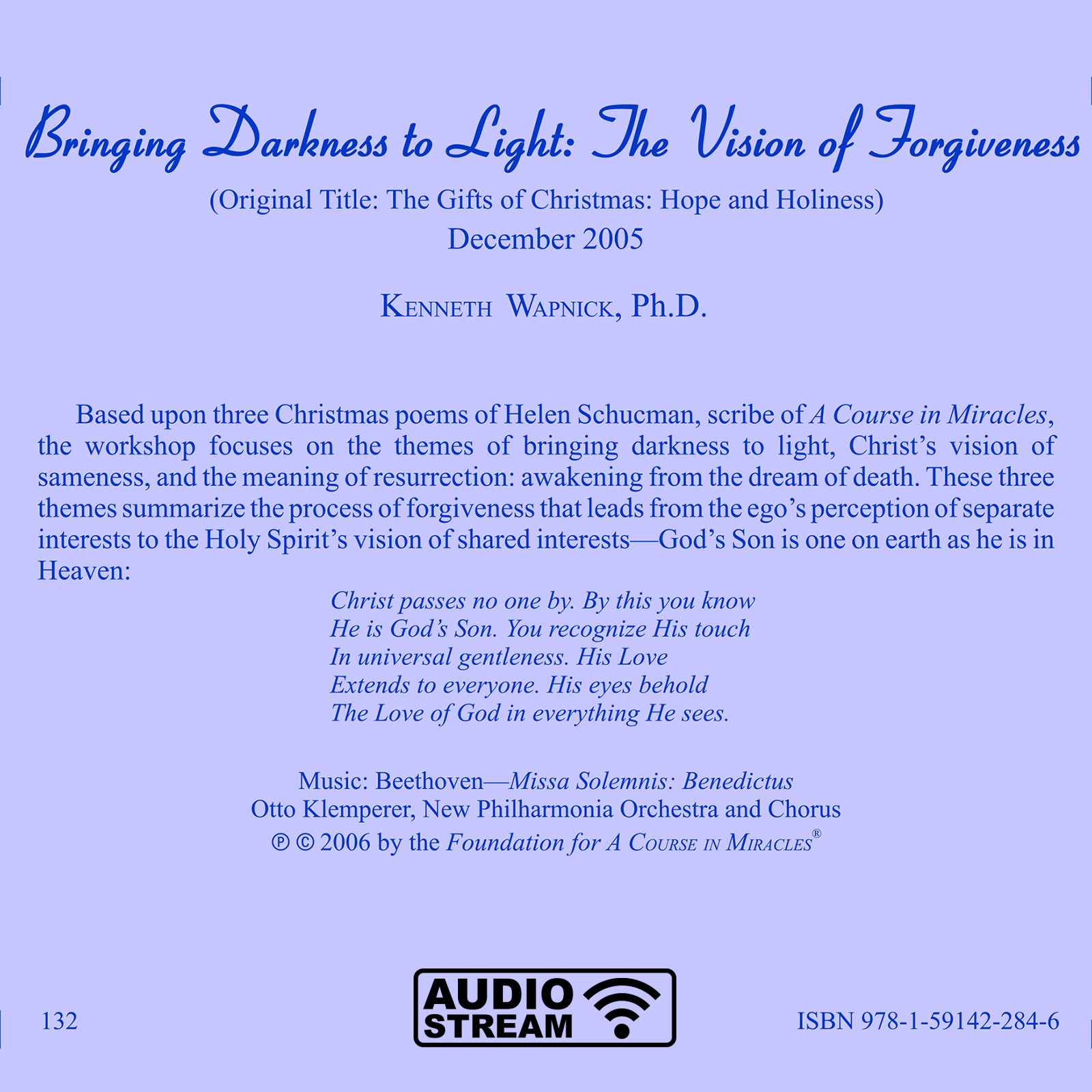 Based upon three Christmas poems of Helen Schucman, scribe of A Course in Miracles, the workshop focuses on the themes of bringing darkness to light, Christ’s vision of sameness, and the meaning of resurrection: awakening from the dream of death. These three themes summarize the process of forgiveness that leads from the ego’s perception of separate interests to the Holy Spirit’s vision of shared interests—God’s Son is one on earth as he is in Heaven: