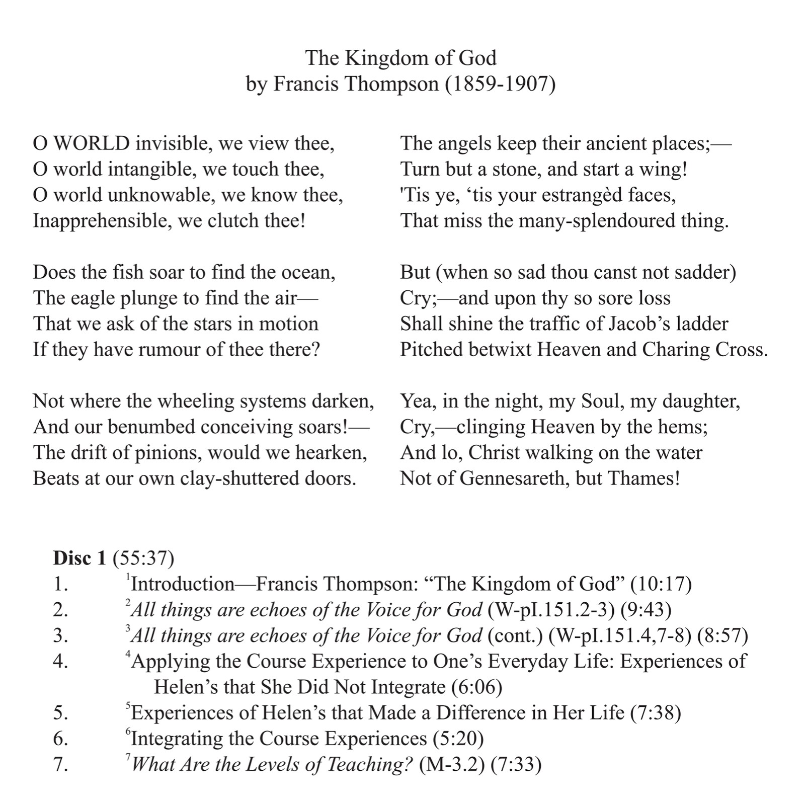Francis Thompson’s poem “The Kingdom of God” provides the setting for this presentation of the powerfully transforming effect of our daily practice of forgiveness. If we would not be among the “estranged faces, / That miss the many-splendored thing,” we must open our hearts to allow the mindset of A Course in Miracles to replace the narrow, selfish focus of the ego thought system we have chosen. A discussion of some of Helen Schucman’s visions highlights the importance of integrating the Course’s message of love’s all-inclusiveness so that it is reflected in our daily experience. The love of Jesus within us then is no longer an abstract principle and therefore extends through us as we recognize Christ’s innocence in everyone. This is the “many-splendored thing.”.
