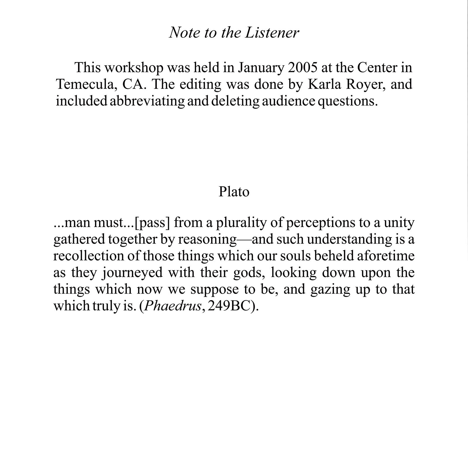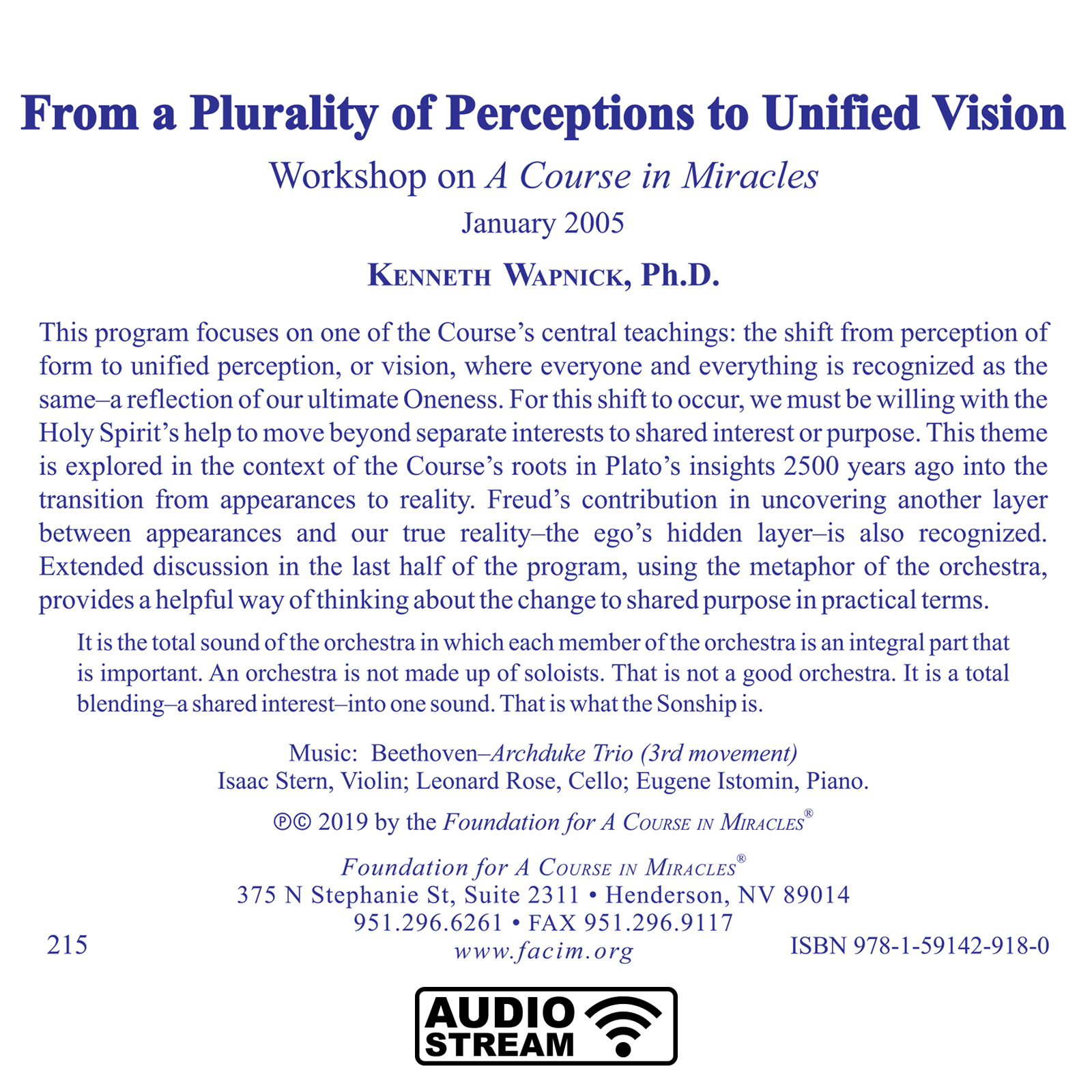 This program focuses on one of the Course’s central teachings: the shift from perception of form to unified perception, or vision, where everyone and everything is recognized as the same–a reflection of our ultimate Oneness. For this shift to occur, we must be willing with the Holy Spirit’s help to move beyond separate interests to shared interest or purpose. This theme is explored in the context of the Course’s roots in Plato’s insights 2500 years ago into the transition from appearances to reality. Freud’s contribution in uncovering another layer between appearances and our true reality–the ego’s hidden layer–is also recognized. Extended discussion in the last half of the program, using the metaphor of the orchestra, provides a helpful way of thinking about the change to shared purpose in practical terms.