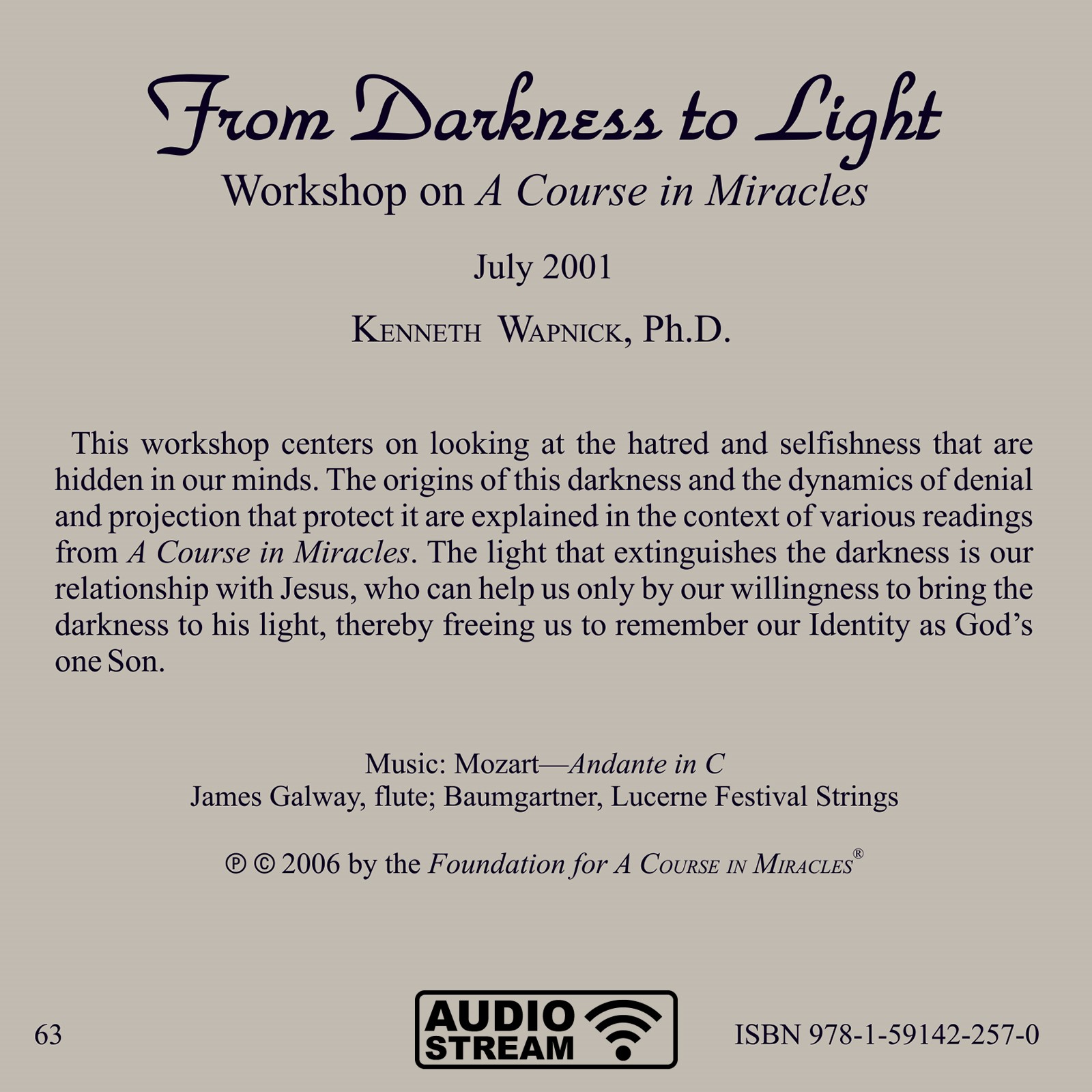 This workshop centers on looking at the hatred and selfishness that are hidden in our minds. The origins of this darkness and the dynamics of denial and projection that protect it are explained in the context of various readings from A Course in Miracles. The light that extinguishes the darkness is our relationship with Jesus, who can help us only by our willingness to bring the darkness to his light, thereby freeing us to remember our Identity as God’s one Son.