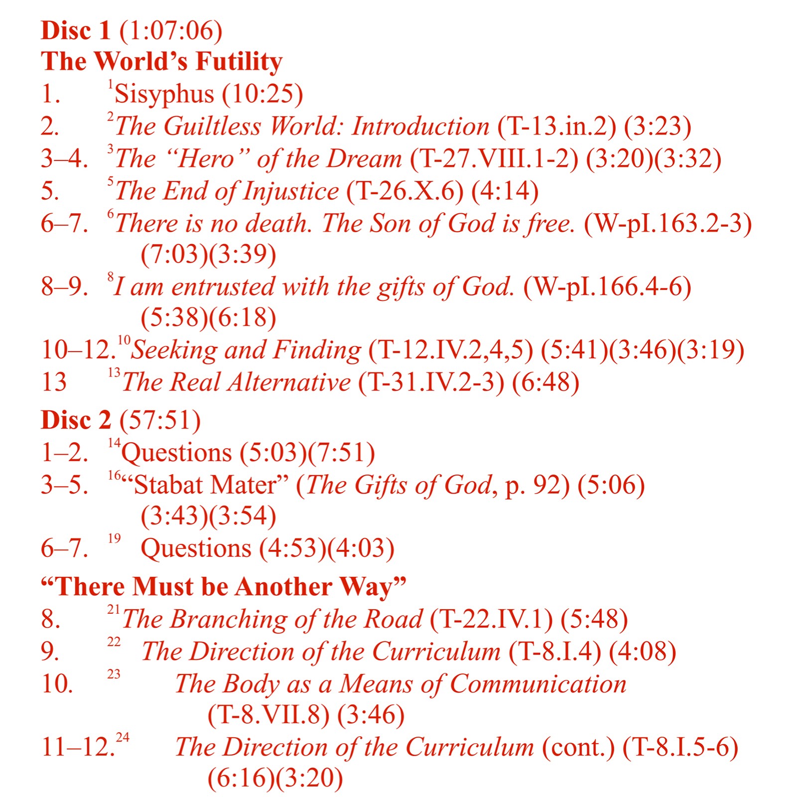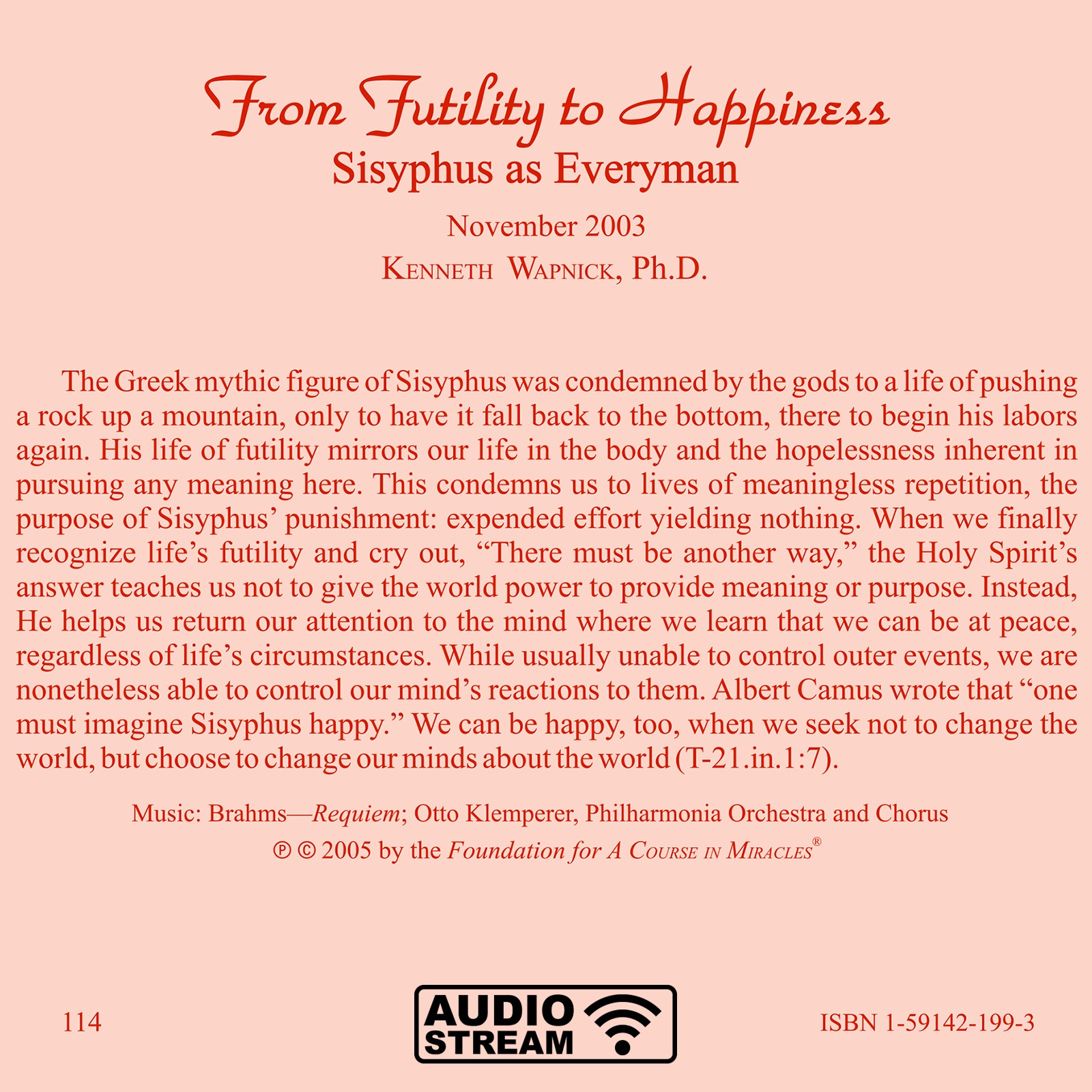 The Greek mythic figure of Sisyphus was condemned by the gods to a life of pushing a rock up a mountain only to have it fall back down to the bottom, there to begin his labors again. His life of futility mirrors our life in the body and the hopelessness inherent in pursuing any meaning in the world. The first part of this book addresses this view as presented in A Course in Miracles, summarized in the idea that we can never be truly happy in this world because it is not our home. The second part discusses the transition from futility to happiness in the context of the Course’s offering of another way of looking at our seeming fate, reflecting Albert Camus’ important essay on Sisyphus, which he ended by stating, “We must imagine Sisyphus happy.” Through a change of mind brought about by changing our inner teacher from the ego to the Jesus, our lives of futility are transformed into opportunities of unlearning the ego’s thought system. A purposeless life of inherent meaninglessness thus metamorphoses into a meaningful classroom that leads us to the Heaven we never truly left.