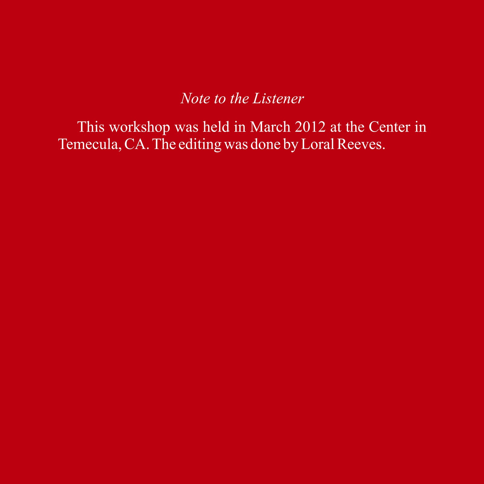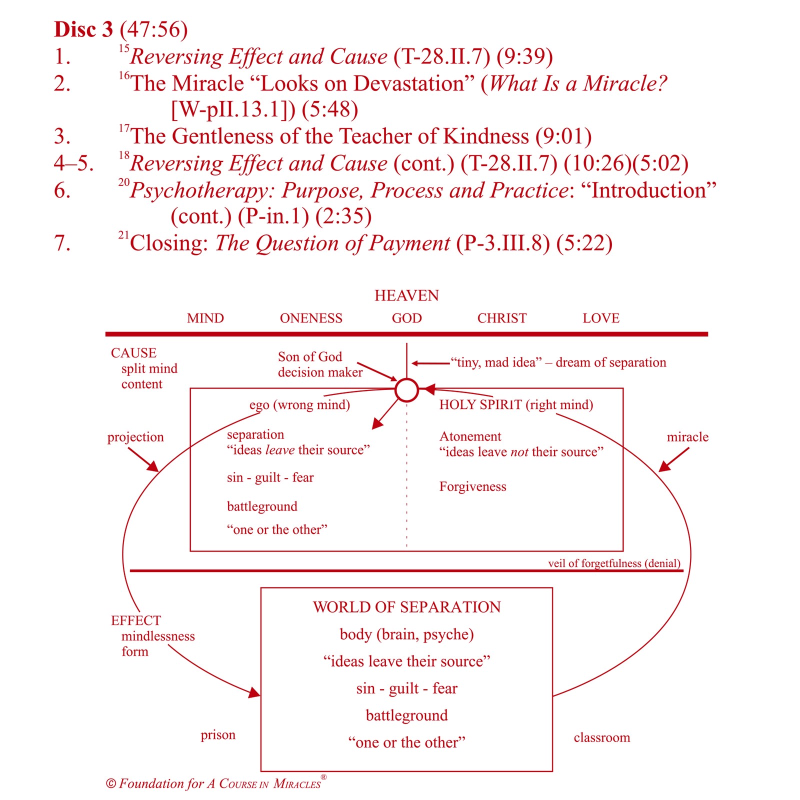 Healing of others can never occur without the Holy Spirit’s healing extending through us. This 2012 workshop therefore focuses on the necessity of bringing to Him our ego thoughts so that His healing light can dissolve the darkness of our mind’s guilt. As the Psychotherapy pamphlet says: “Only the mind can be sick, only the mind can be healed.” Moreover, since we are almost totally identified with the mindless body, indirect learning is needed wherein we focus on the worldly experiences of our special relationships as the means of leading us back to the decision-making mind so we can choose again: forgiveness over judgment, healing over sickness.