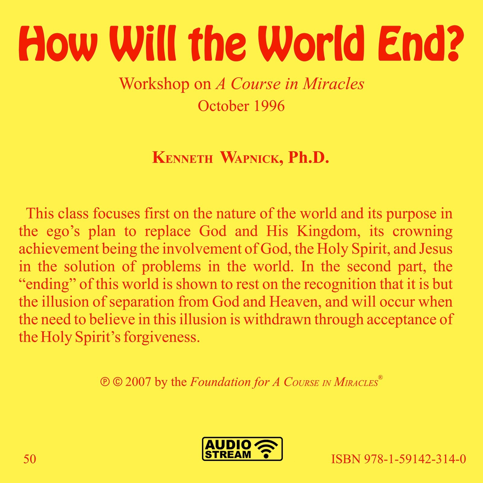 The title of this workshop is taken from the section of the same name in the manual for teachers. This class focuses first on the nature of the world and its purpose in the ego’s plan to replace God and His Kingdom, with its crowning achievement being the involvement of God, the Holy Spirit, and Jesus in the solution of problems in the world. In the second part of this workshop, the “ending” of this world is shown to rest on the recognition that it is but the illusion of separation from God and Heaven and that its ending therefore will occur when the need to believe in this illusion is withdrawn through acceptance of the Holy Spirit’s forgiveness.