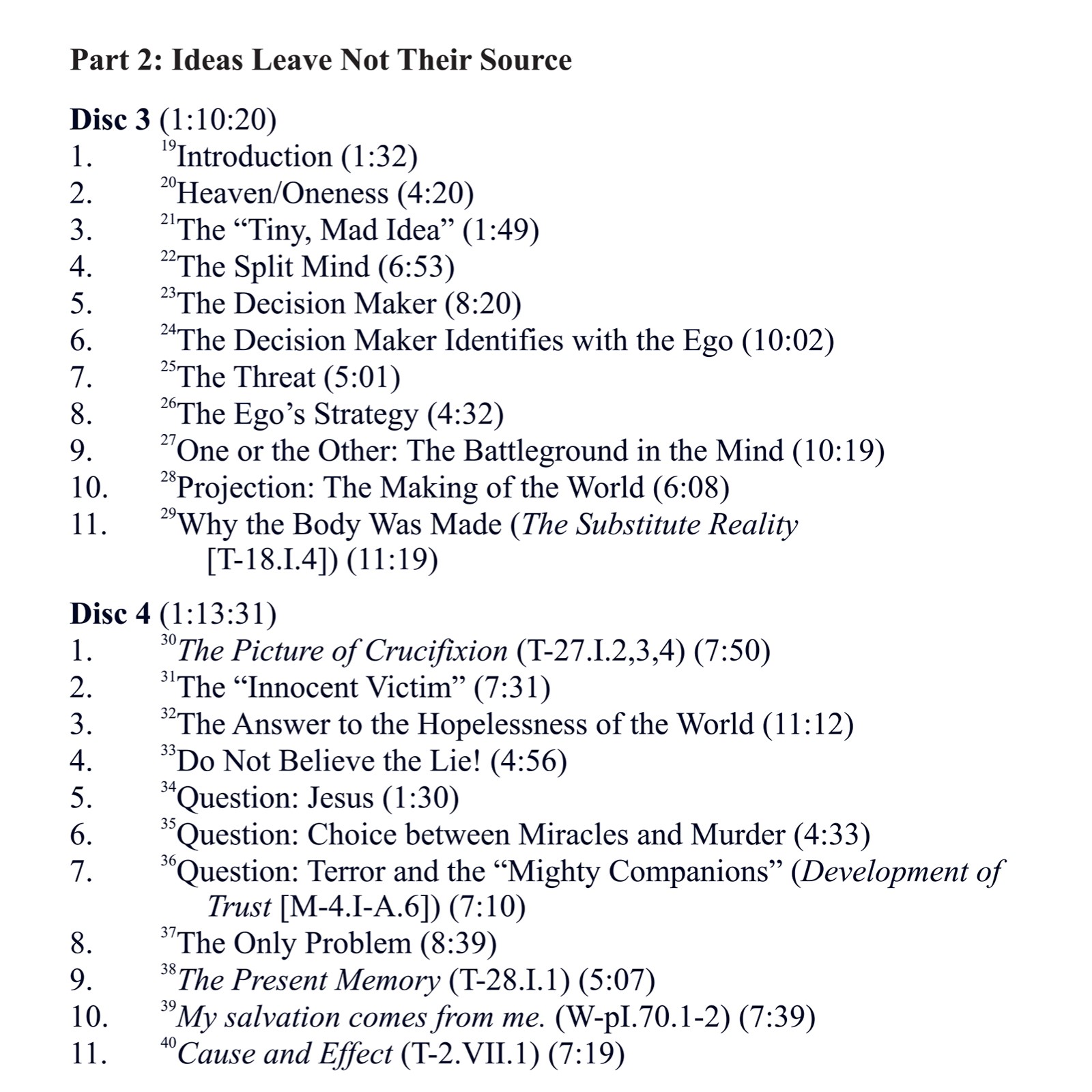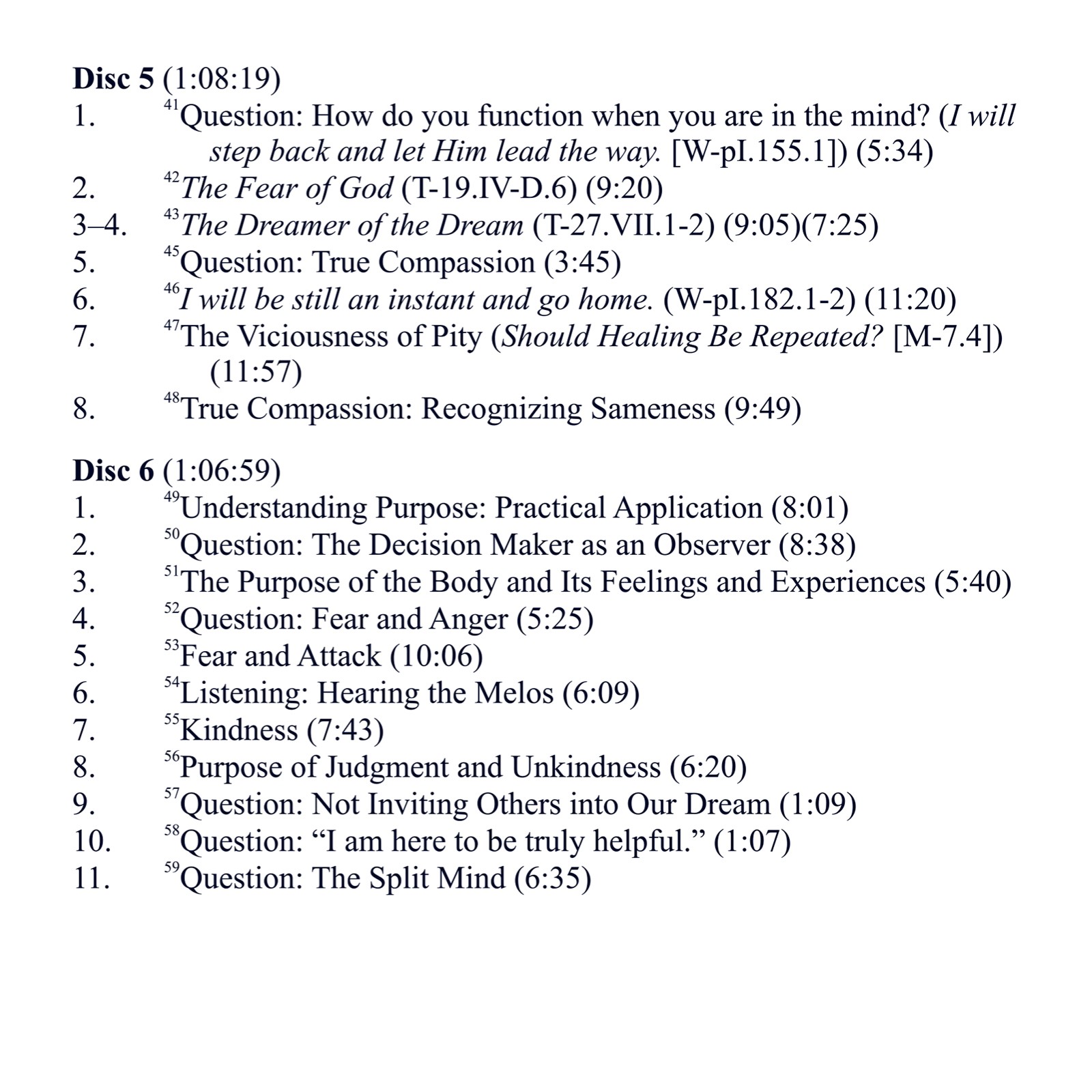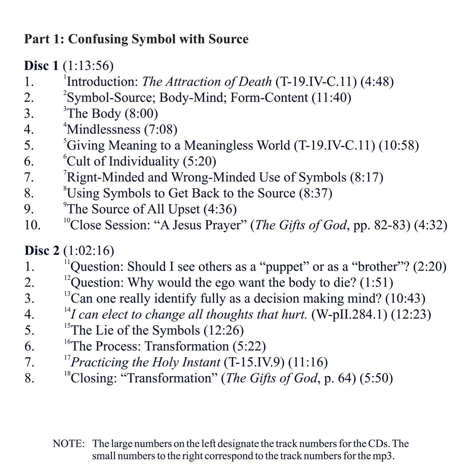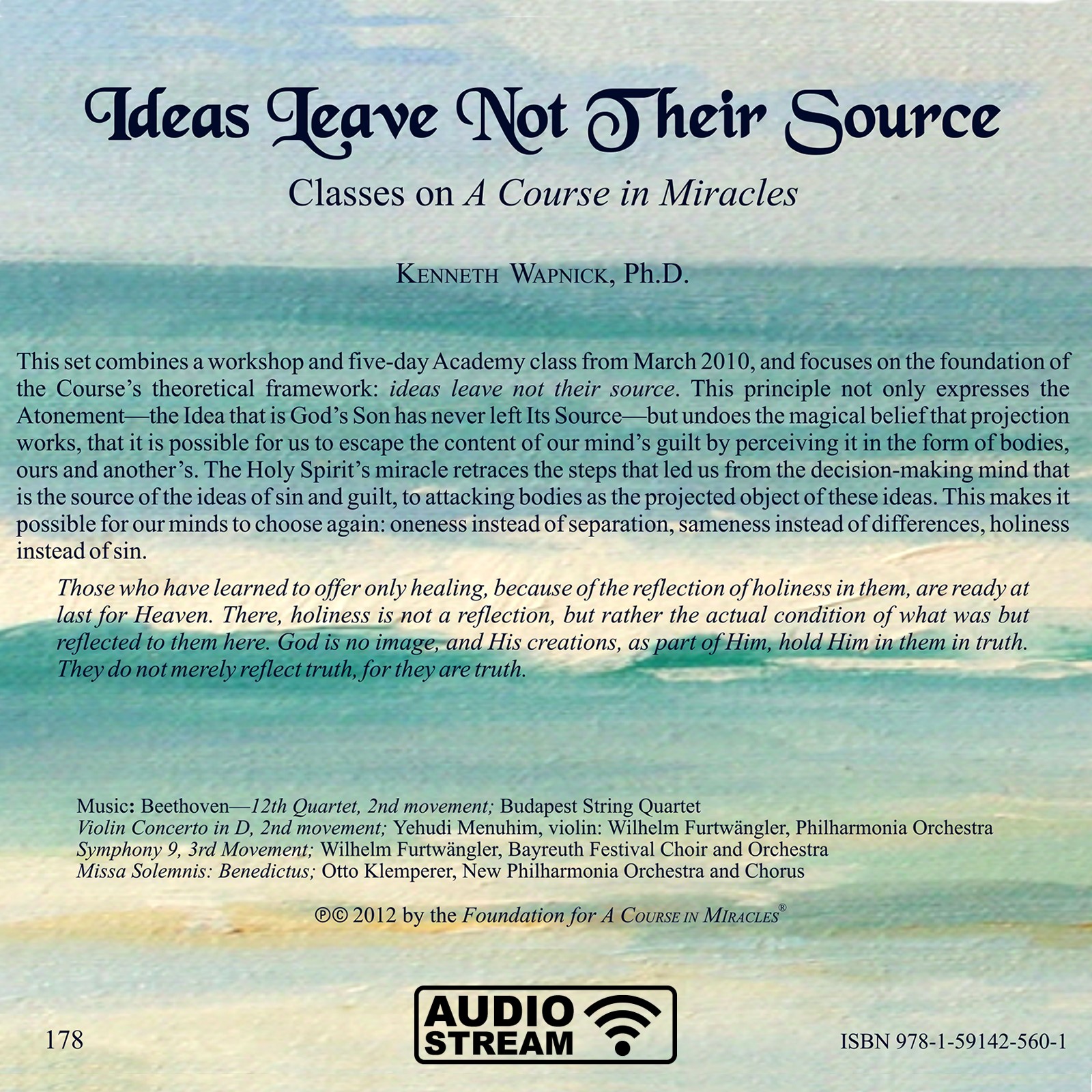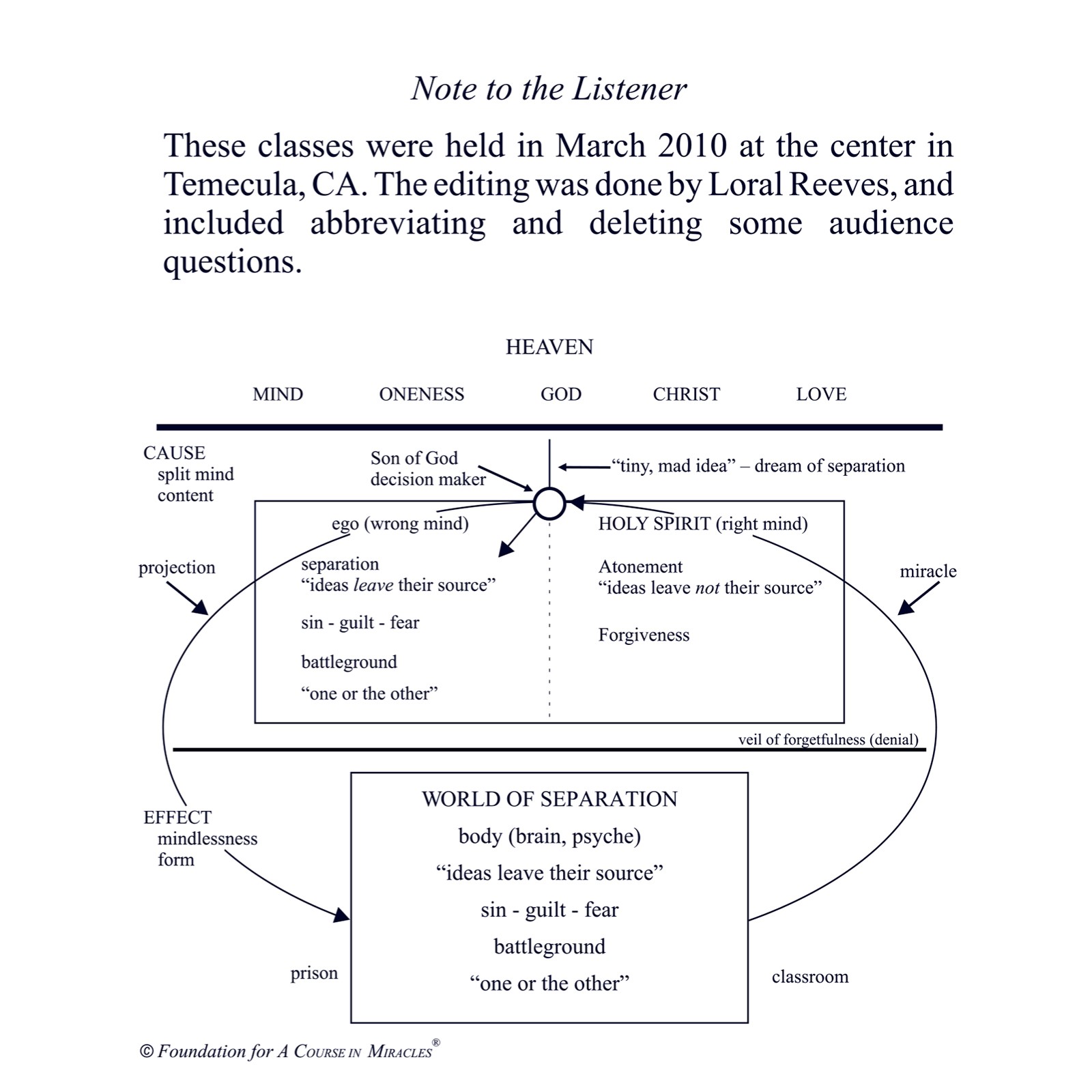 This set combines a workshop and five-day Academy class from March 2010, and focuses on the foundation of the Course’s theoretical framework: ideas leave not their source. This principle not only expresses the Atonement—the Idea that is God’s Son has never left Its Source—but undoes the magical belief that projection works, that it is possible for us to escape the content of our mind’s guilt by perceiving it in the form of bodies, ours and another’s. The Holy Spirit’s miracle retraces the steps that led us from the decision-making mind that is the source of the ideas of sin and guilt, to attacking bodies as the projected object of these ideas. This makes it possible for our minds to choose again: oneness instead of separation, sameness instead of differences, holiness instead of sin.