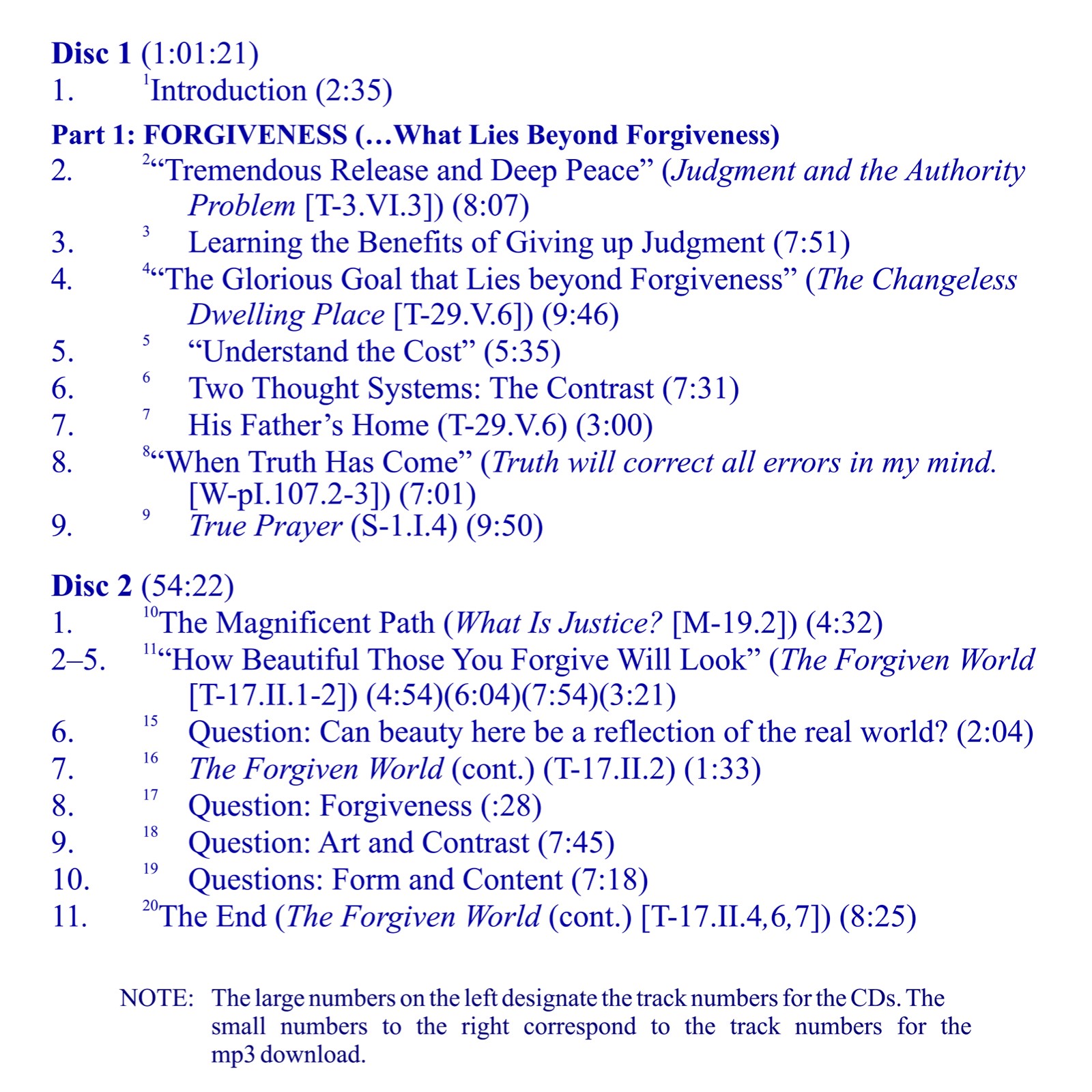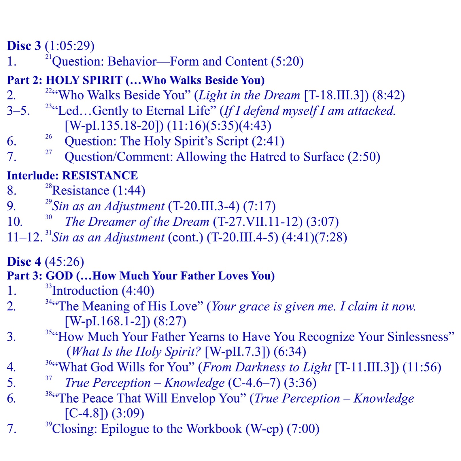 Throughout A Course in Miracles, Jesus promises us the wonderful future that awaits us when we follow his gentle guidance: If you but knew…. The workshop is divided into three sections that reflect the categories of these statements. The first centers on forgiveness, and describes our peace when we practice our daily lessons, and how beautiful the world will look when seen through the eyes that have forgiven sin. The second describes the joy that comes when we walk with the Holy Spirit, having chosen Him as the Teacher of peace instead of the ego’s teachings on fear and pain. An interlude precedes the third section and briefly discusses our resistance to accepting these promises, born of the fear of losing our self. The final group of promises reminds us of our Father’s Love and the happiness that is ours when we remember.