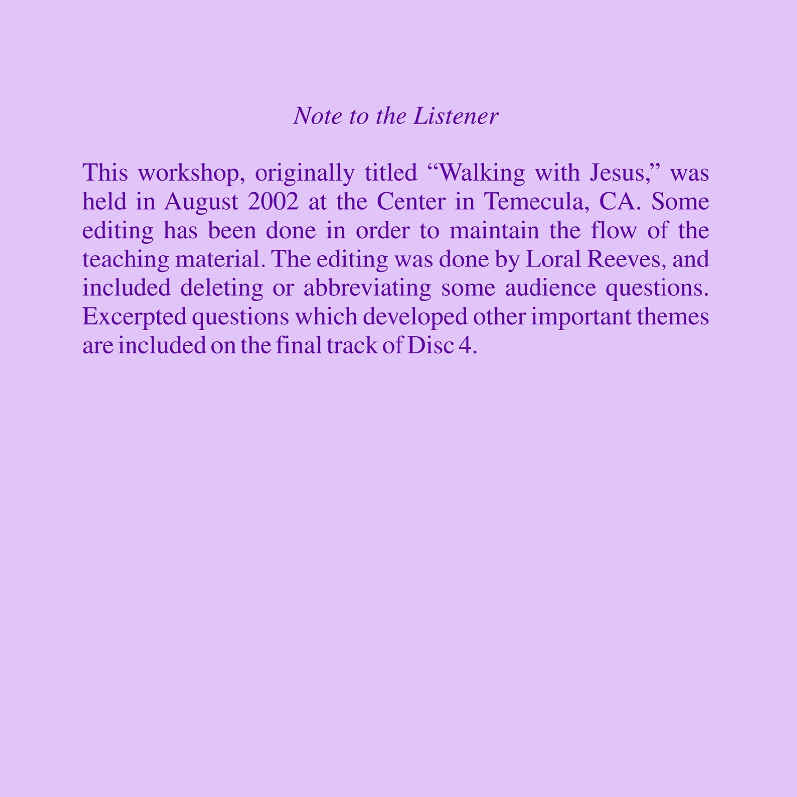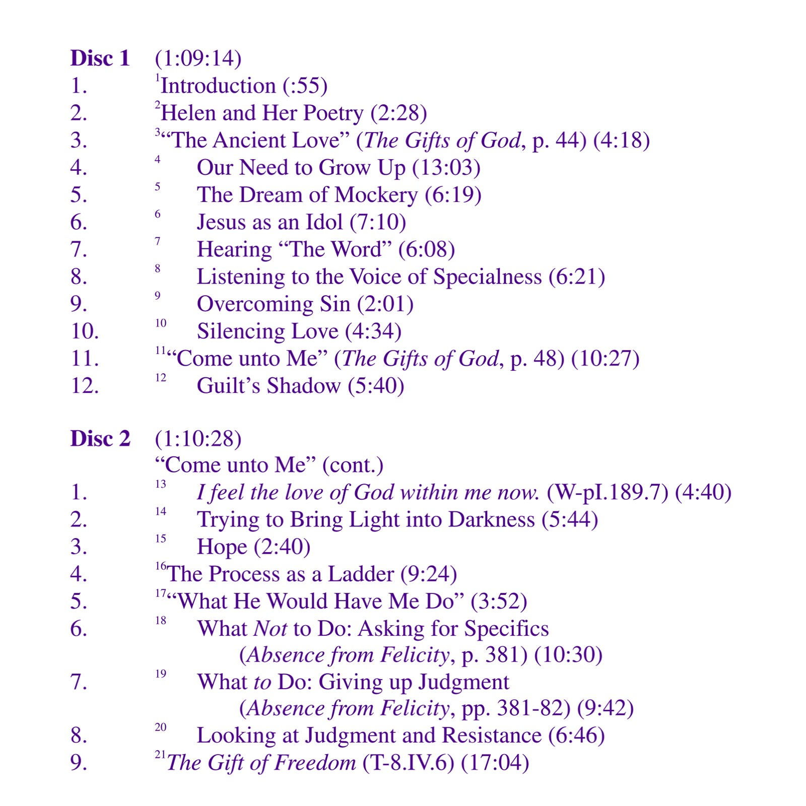 This 2002 workshop combines poems of Helen Schucman with readings from A Course in Miracles in discussing our love-hate relationship with Jesus. Our hate is born of the fear of growing up to become like him, thereby turning away from our specialness. This need to keep Jesus in our own image and likeness is reflected in “the dream of mockery” the world has made of him. Accepting our ultimate oneness with him is foreshadowed by the recognition of our inherent oneness with all the Sonship. In that vision is our ascent up the ladder assured, as we grow to awaken to the truth of our Identity as God’s one Son.