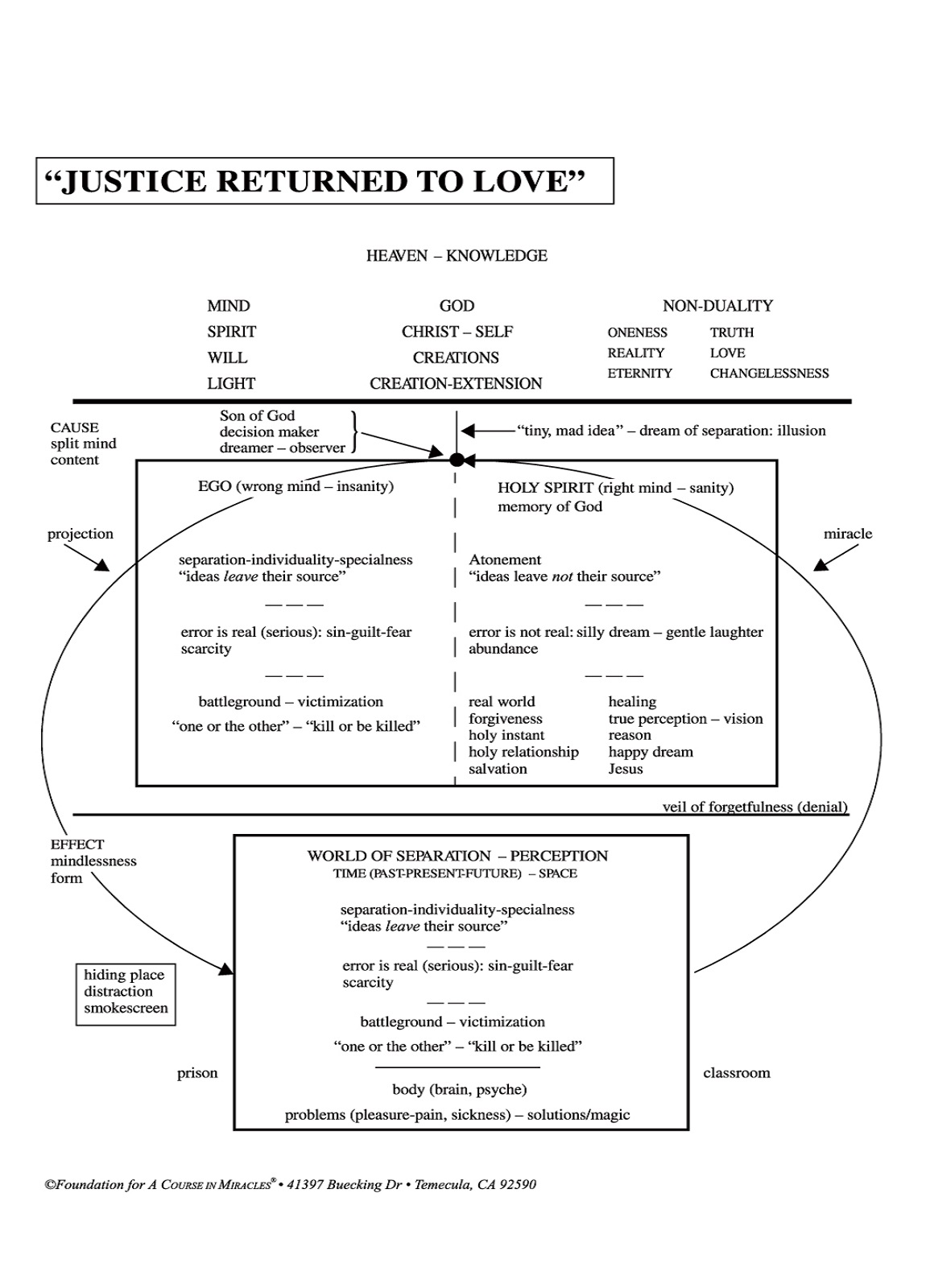 Returning justice to love represents the correction of the ego's original injustice, which is the idea that we were unfairly treated by God and therefore justified in attacking and separating from Him. A thought system of sacrifice emerged, based upon separate and competing interests, forming the basis of the world's concepts of injustice and justice. Justice became defined in the context of punishing unfairness or evil, judged to be in others and not in those administering the justice. Returning justice to love is choosing the Holy Spirit's perception that we are all the same—guilty and innocent—and share a common interest of returning home to God.
