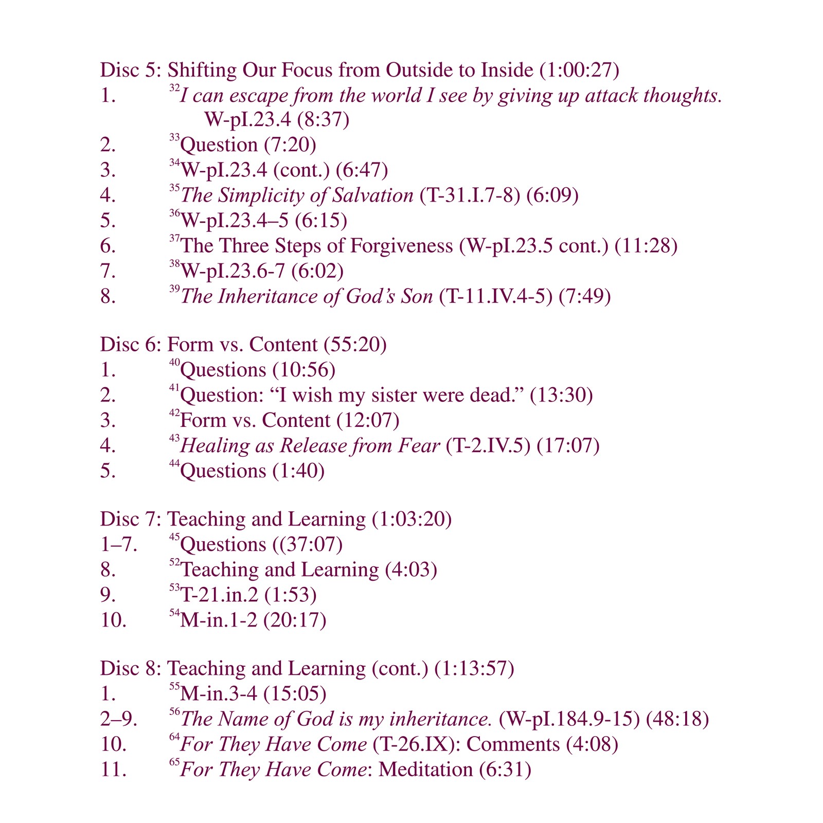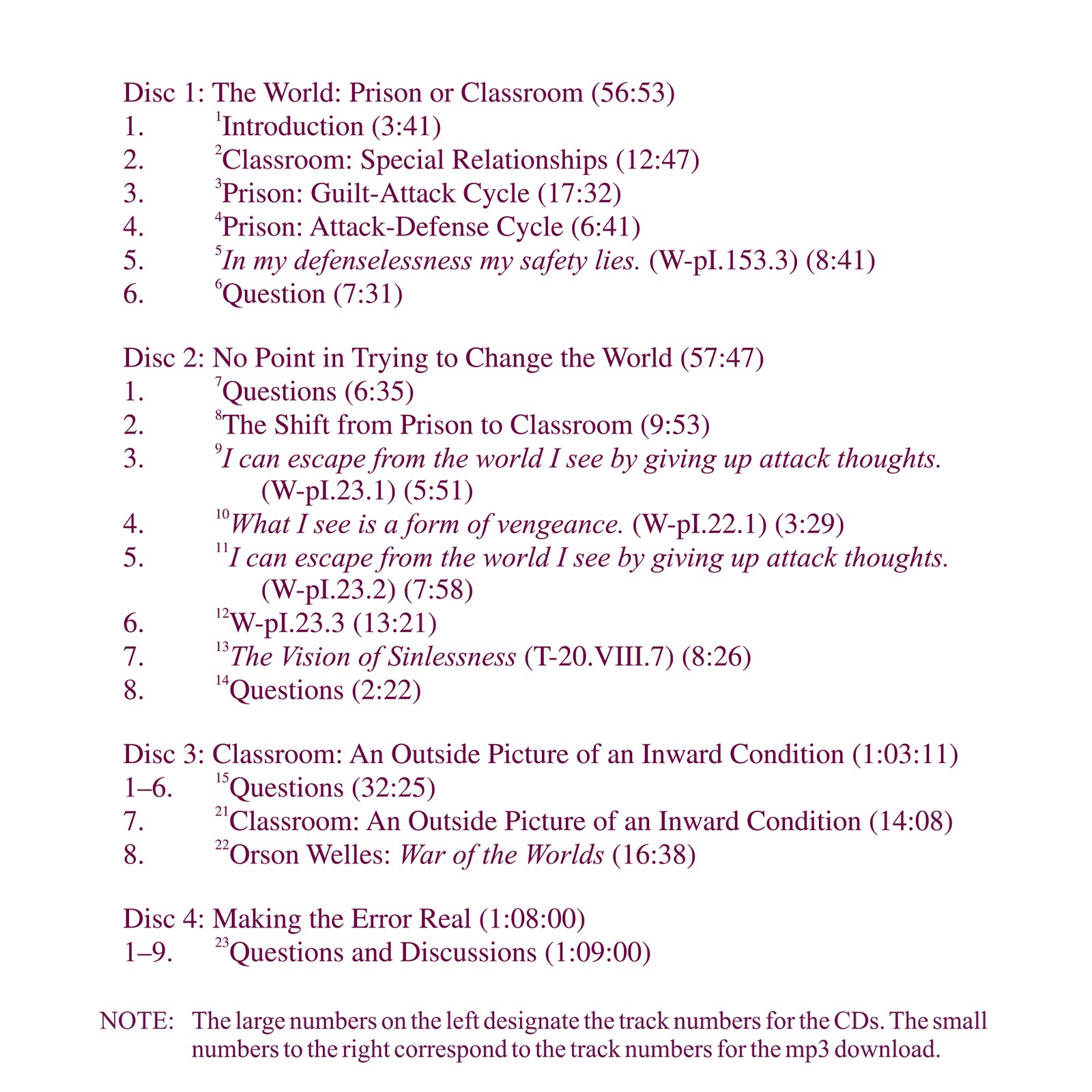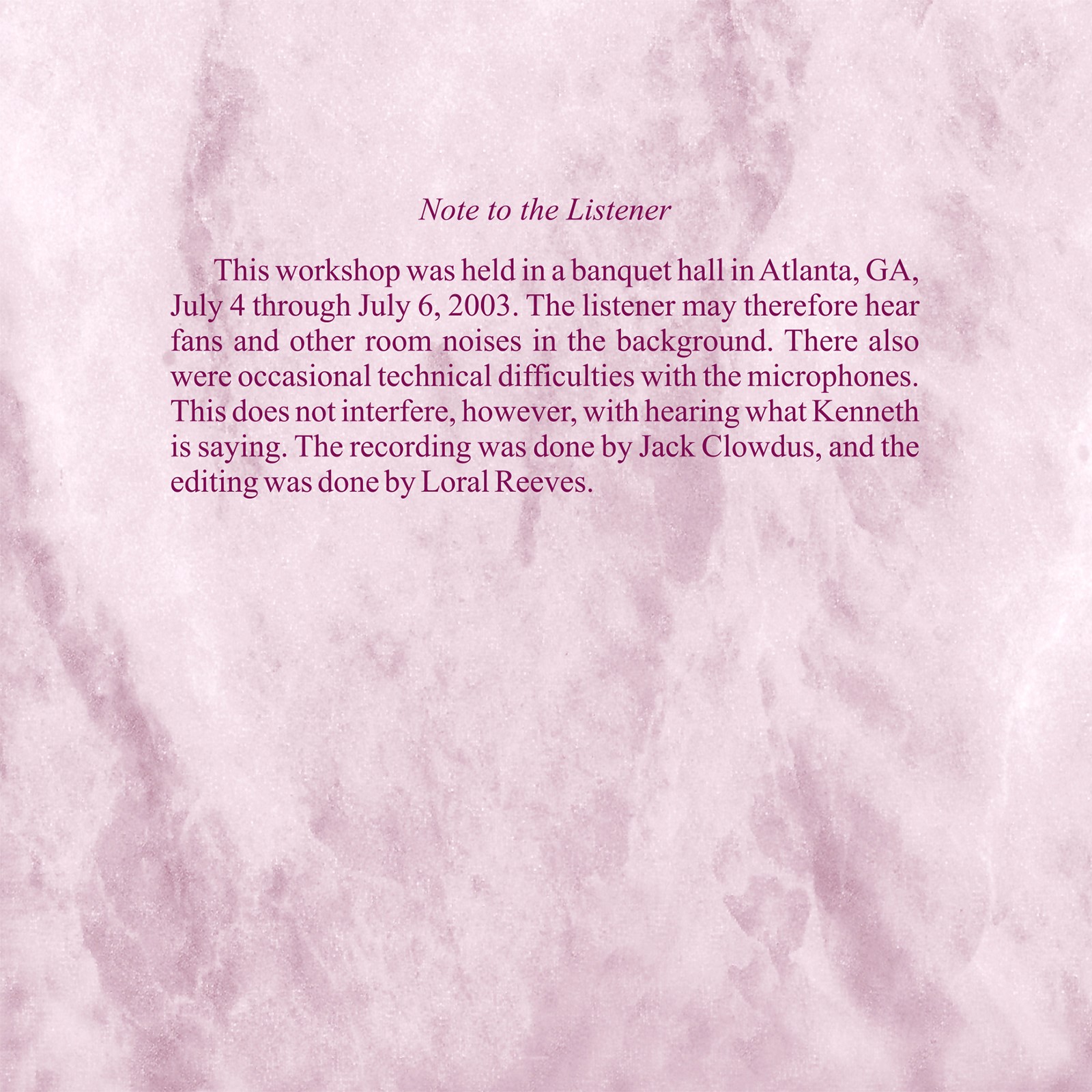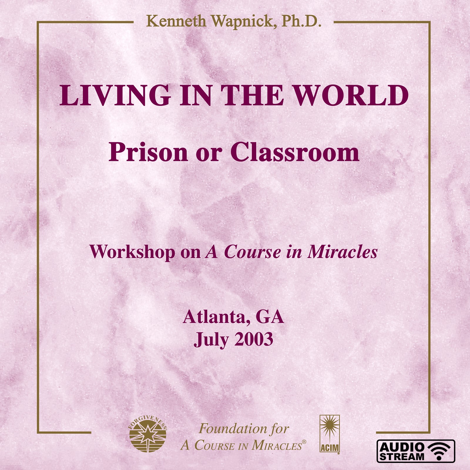 At the heart of this weekend workshop, held in Atlanta in July 2003, living in the world according to A Course in Miracles‘ principle of forgiveness is discussed in the context of our teaching and learning, with special emphasis given to the idea that teaching is demonstration, and we learn what we teach. We demonstrate either the ego’s thought system of separation and individuality through the cycles of guilt-attack and attack-defense; or the Holy Spirit’s thought system of innocence and defenselessness. The former leads to a perception of the world as a prison, while the latter reflects the shift to perceiving the world as a classroom. The workshop’s format integrated lecture, various readings from A Course in Miracles, and questions.