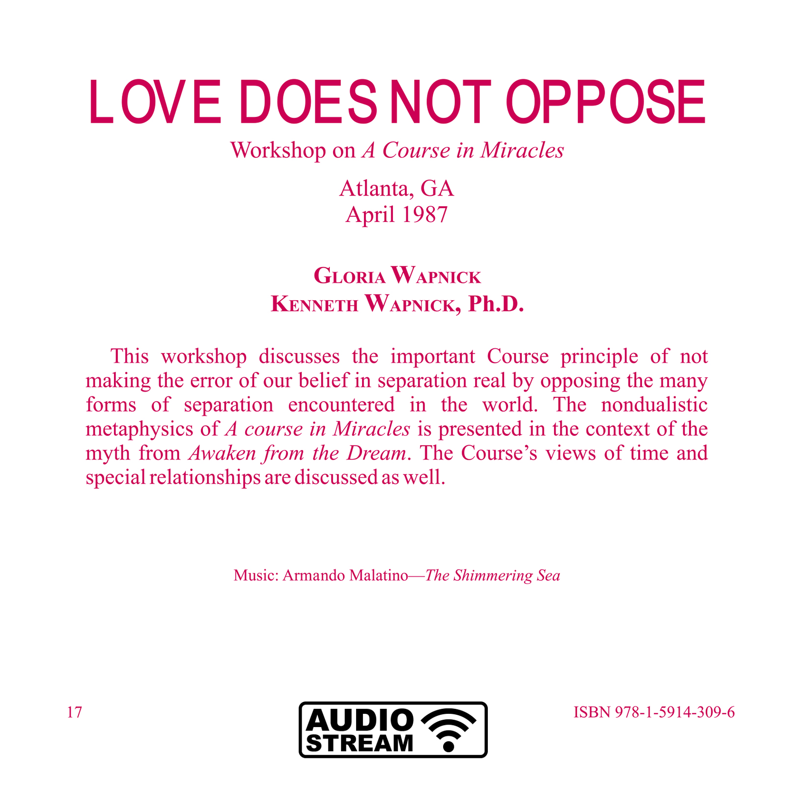 This workshop discusses the important Course principle of not making the error of our belief in separation real by opposing the many forms of separation encountered in the world. The non-dualistic metaphysics of A Course in Miracles is presented in the context of the myth from (clicking on the link that follows will take you to our online store and away from the streaming site) Awaken from the Dream. The Course’s views of time and special relationships are discussed as well.