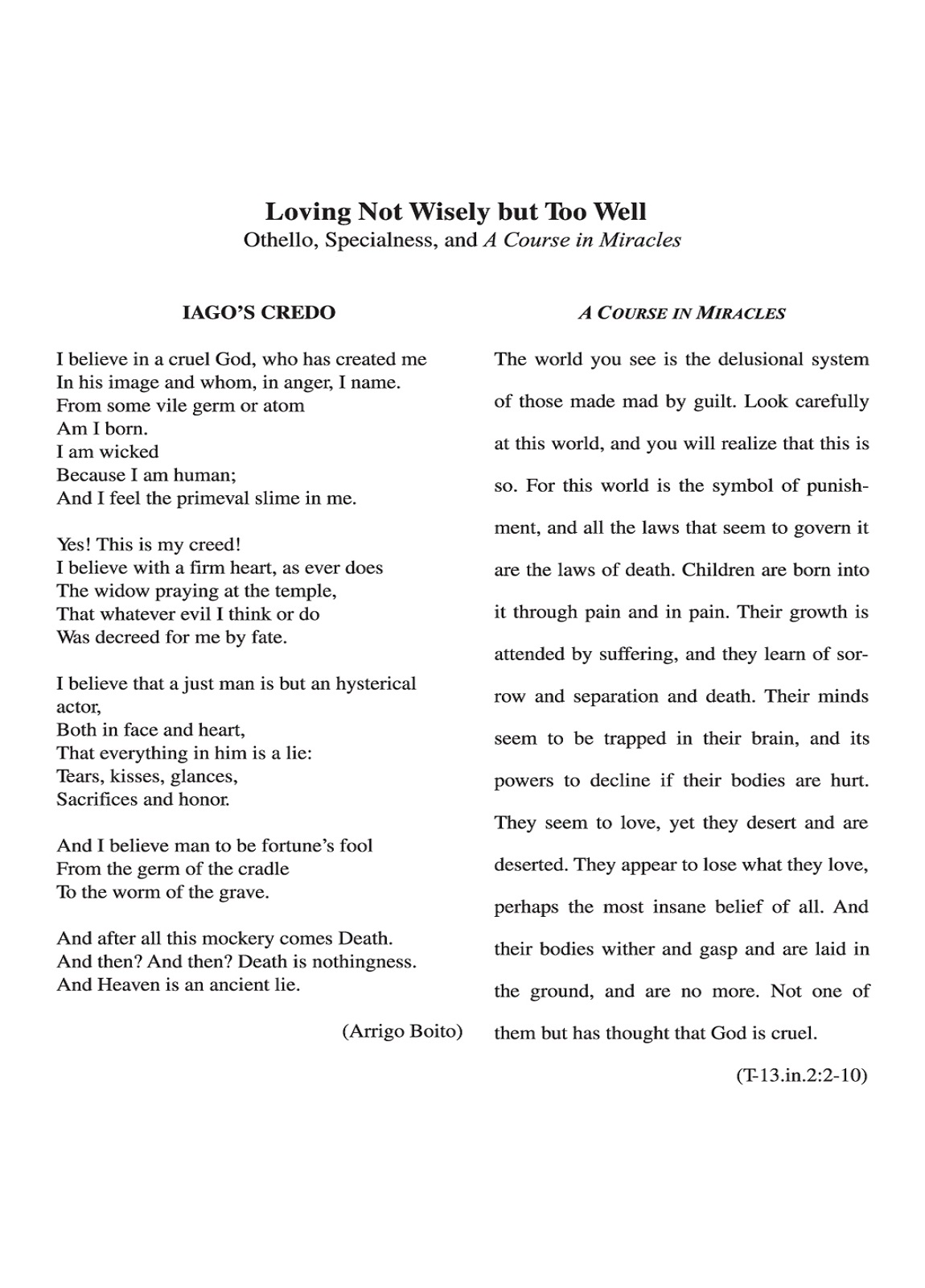 Shakespeare’s Othello, looked at through the lens of A Course in Miracles, offers a penetrating, if not painful insight into the nature of guilt: its origins in our special relationship with God, and its shadowy expression in our personal lives of special relationships. Othello’s choice to believe in Iago’s lies—the ego’s thought system—rather than Desdemona’s innocence—the Atonement—is discussed from the perspective of our need to destroy love, and then experience the horrible consequences of the ensuing guilt. Othello’s decision to trust his "friend" and murder his wife on grounds of infidelity is irrevocable; not so, however, our decision for the ego, which can be undone in the instant we choose to trust our true friend and practice his lessons of forgiveness. Thus does Jesus add a "sixth act" to Shakespeare’s five-act tragedy.