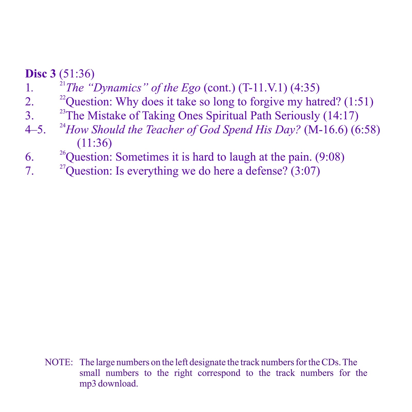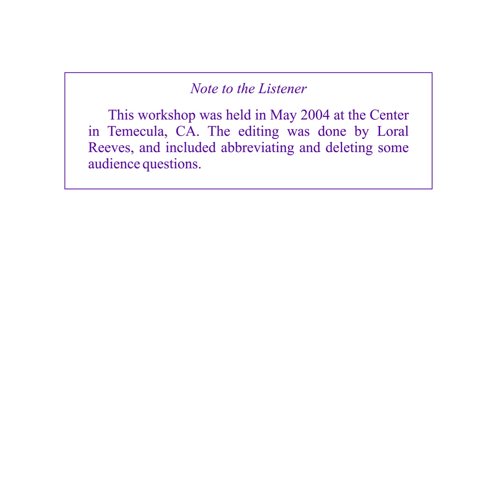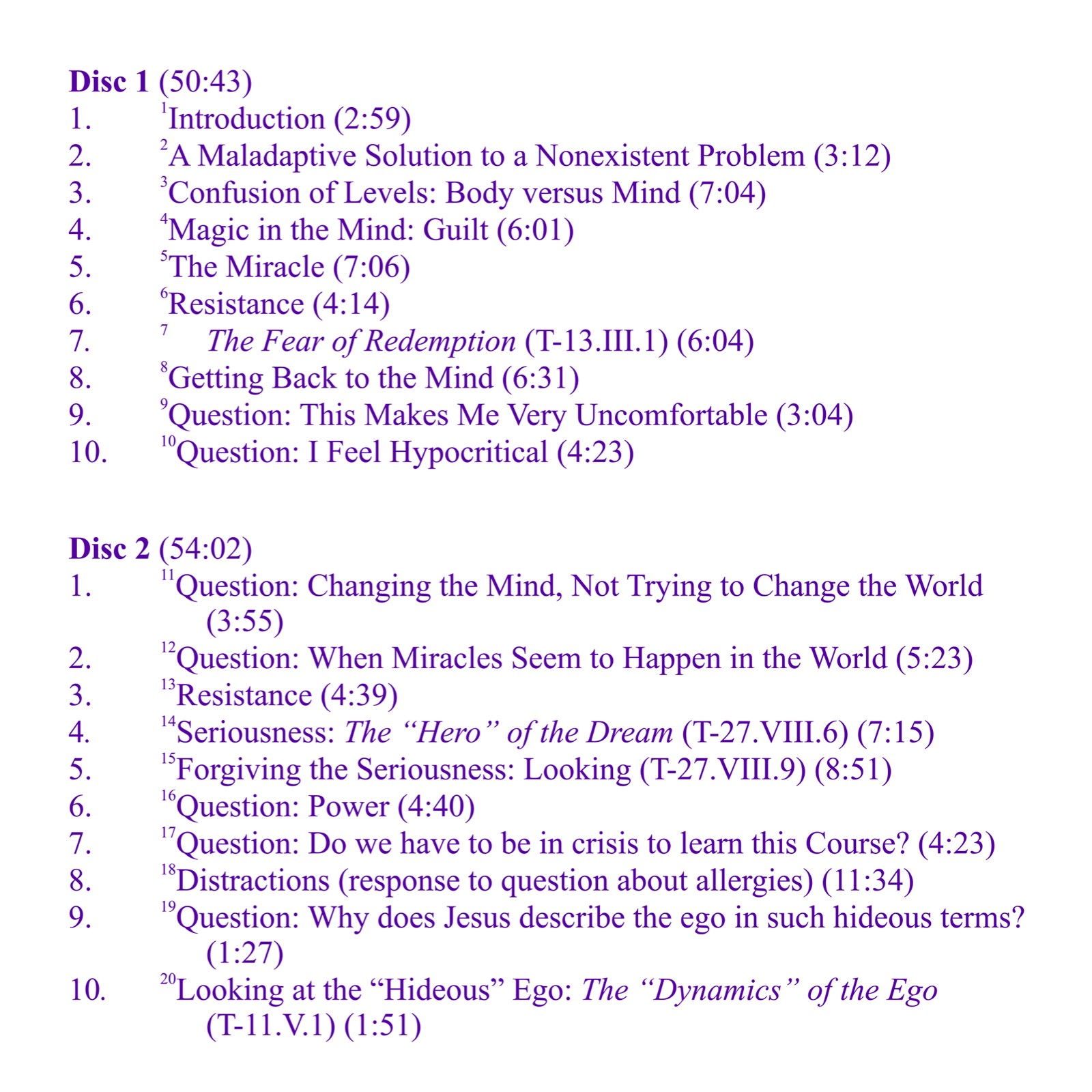 The workshop discusses the differences between miracles and magic; how the latter roots us further in the ego’s dream of separation, while the former gently awakens us. The ego makes up the problem of guilt, projects it from the mind onto the body, and leads us to seek magical solutions in the world that never truly work. Thus the body is a maladaptive solution to a non-existent problem. The miracle, on the other hand, offers us the true solution of forgiveness, which undoes our only problem—the mind’s decision for the ego. Expediting this process is adopting Jesus’ attitude of non-judgment towards our attempts at magic. This alleviates our guilt and frees us to look with open eyes at our mind’s mistake and choose again.