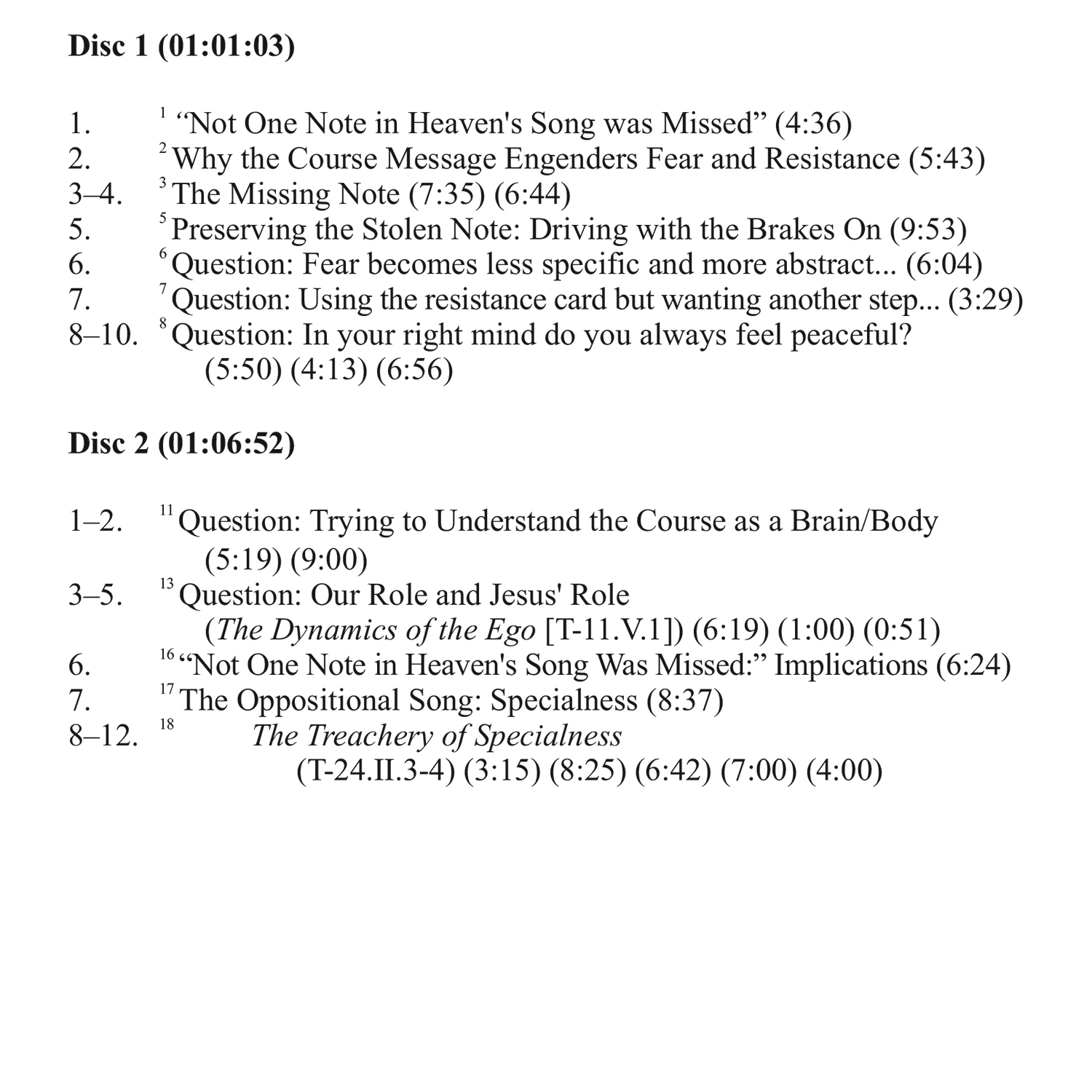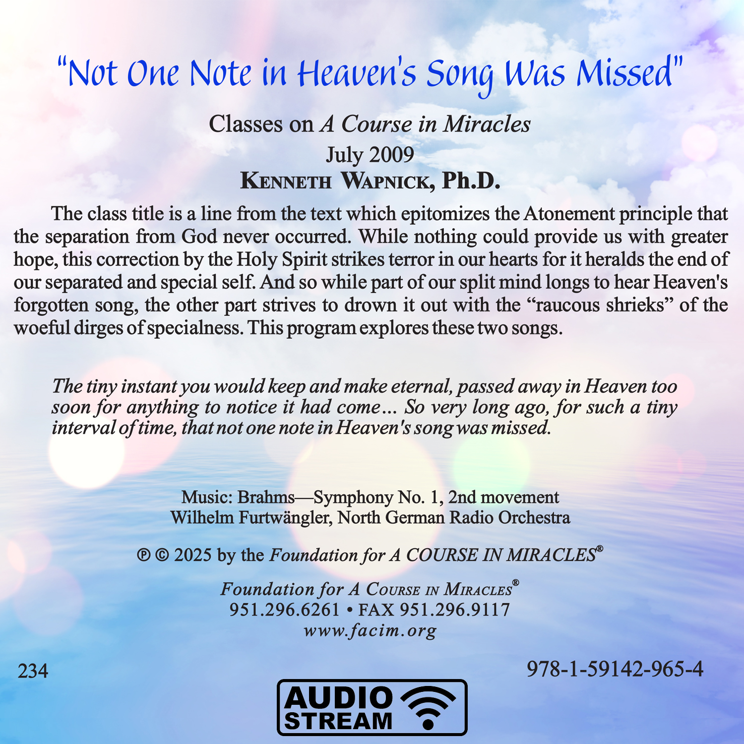 The class title is a line from the text which epitomizes the Atonement principle that the separation from God never occurred. While nothing could provide us with greater hope, this correction by the Holy Spirit strikes terror in our hearts for it heralds the end of our separated and special self. And so while part of our split mind longs to hear Heaven’s forgotten song, the other part strives to drown it out with the “raucous shrieks” of the woeful dirges of specialness. This program explores these two songs.