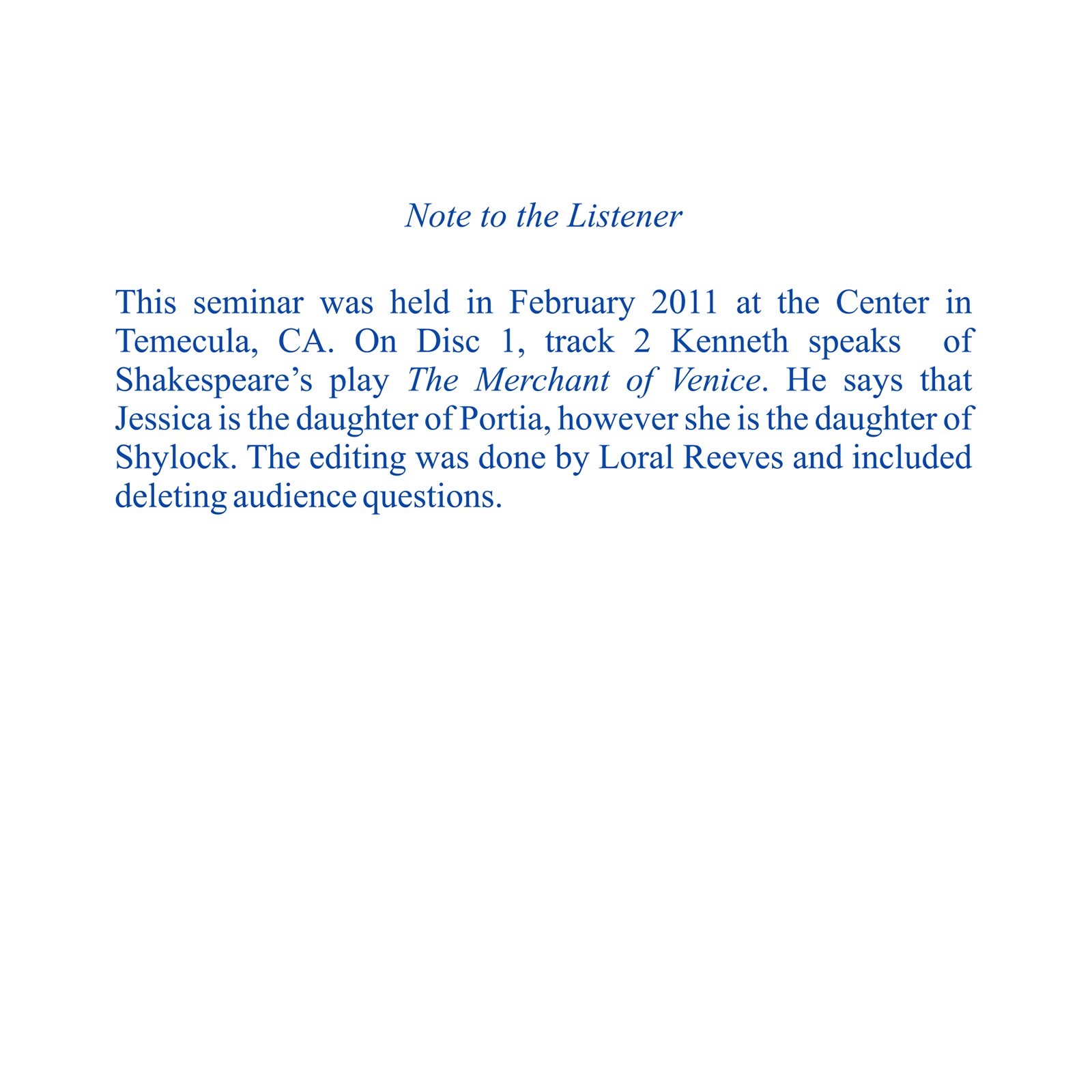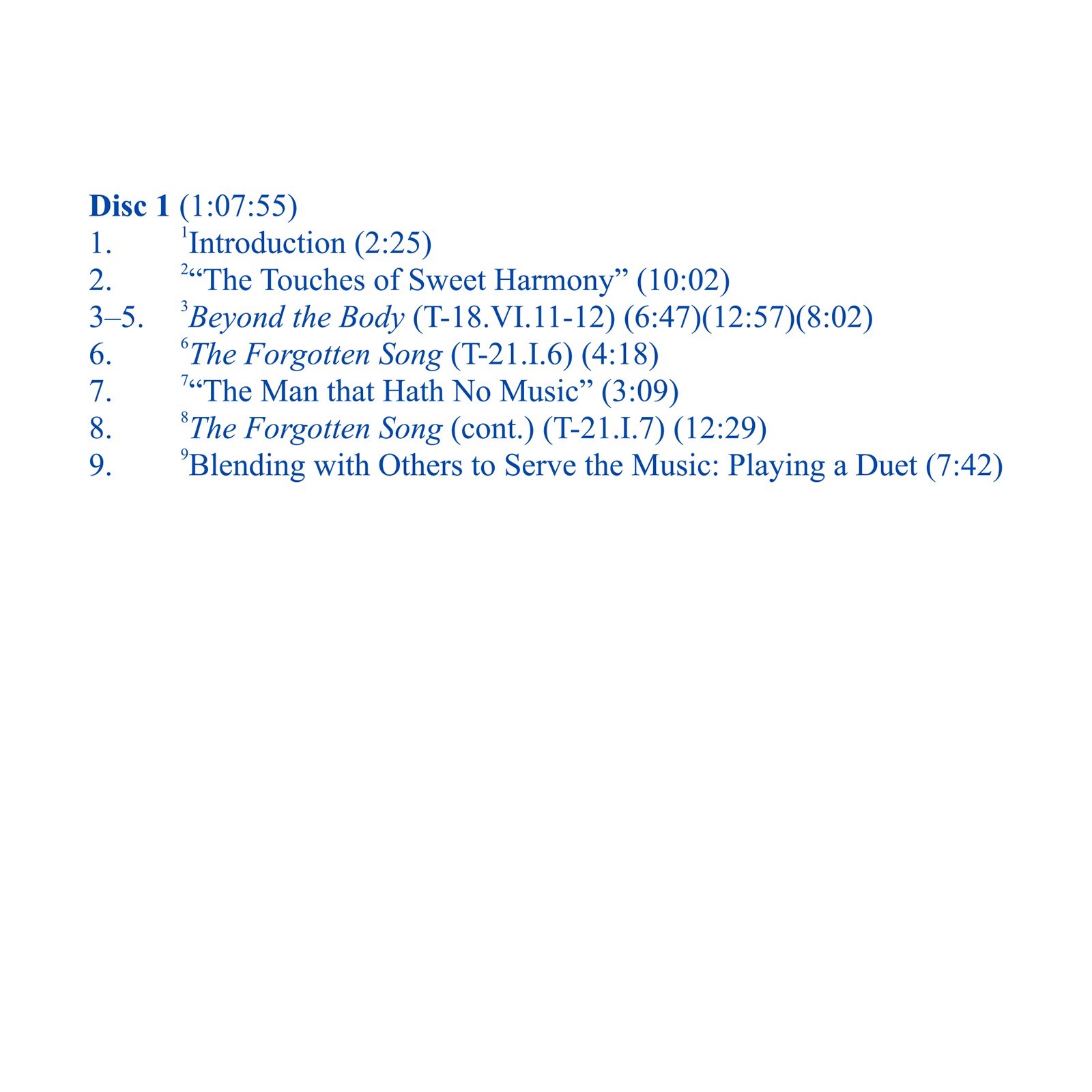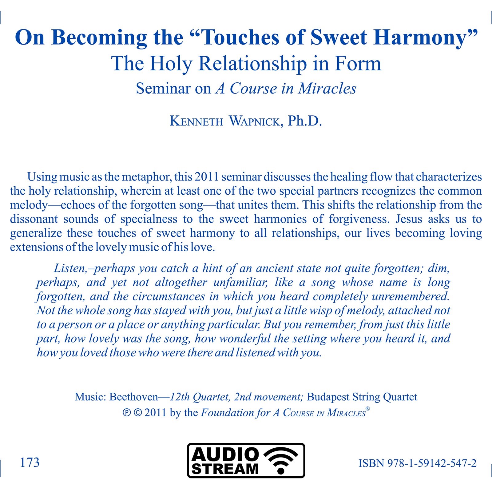 Using music as the metaphor, this 2011 seminar discusses the healing flow that characterizes the holy relationship, wherein at least one of the two special partners recognizes the common melody—echoes of the forgotten song—that unites them. This shifts the relationship from the dissonant sounds of specialness to the sweet harmonies of forgiveness. Jesus asks us to generalize these touches of sweet harmony to all relationships, our lives becoming loving extensions of the lovely music of his love.