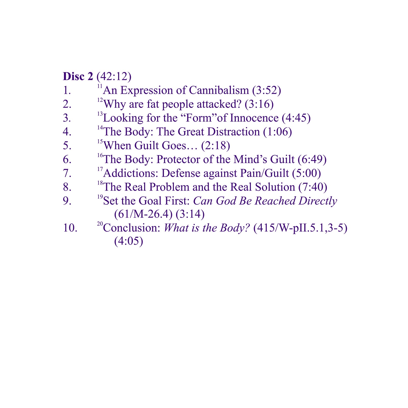 This dialogue presents the Course’s approach to issues such as food addictions and preoccupation with weight. In a discussion with three students of A Course in Miracles, Kenneth points out the ego dynamics involved, and how forgiveness and the choice to accept the Holy Spirit’s purpose of experiencing the peace of God, rather than the ego’s purpose of fostering guilt can be applied to the issues raised.