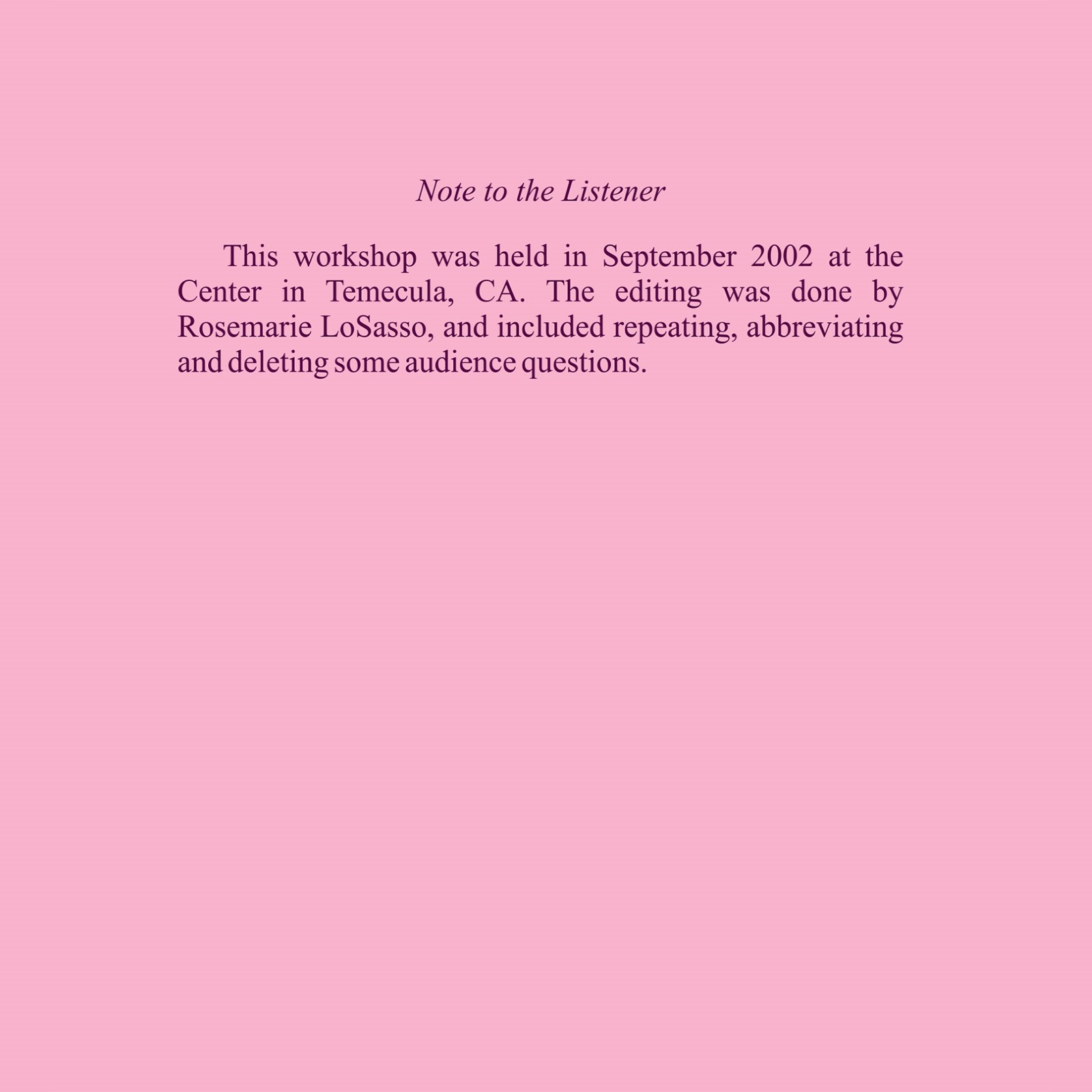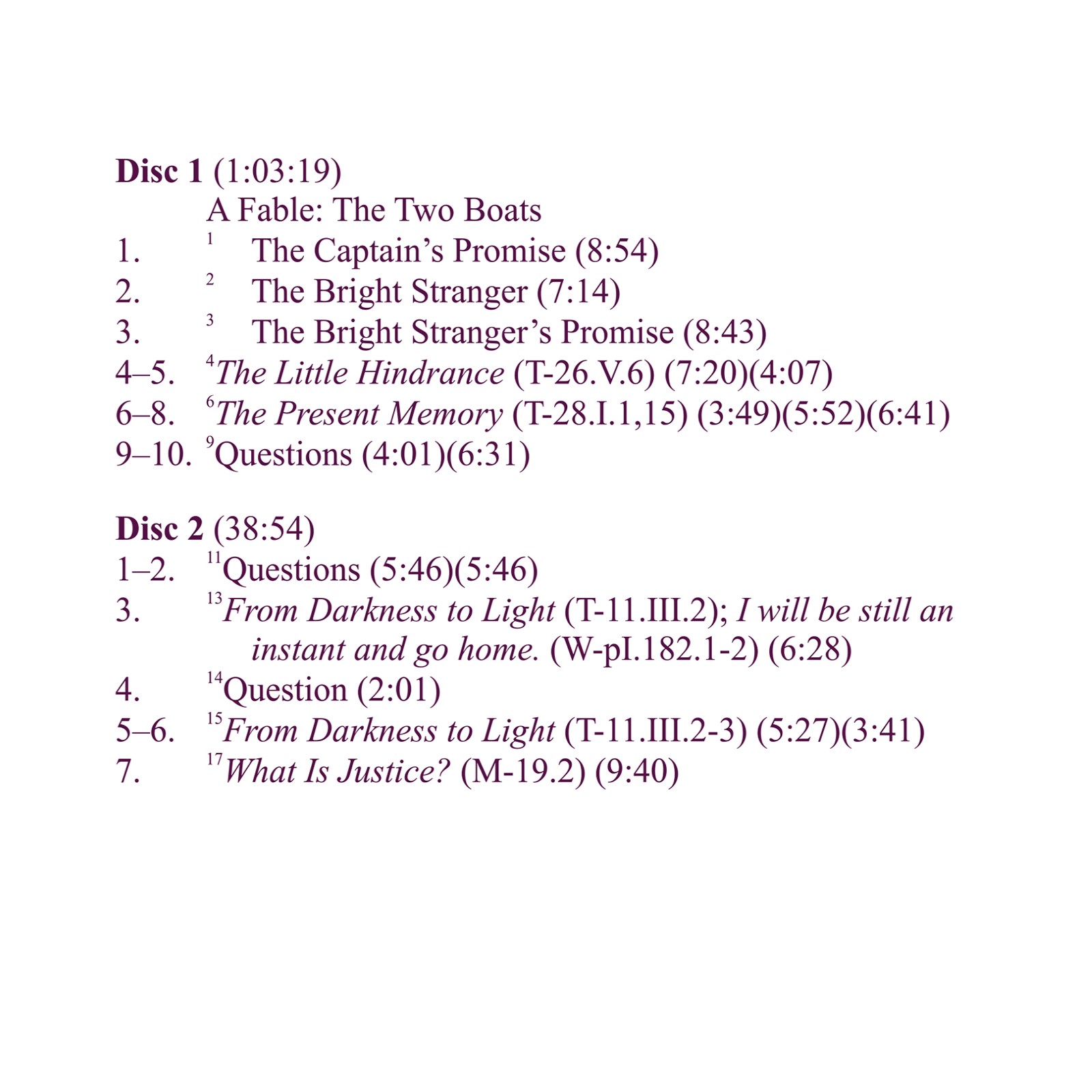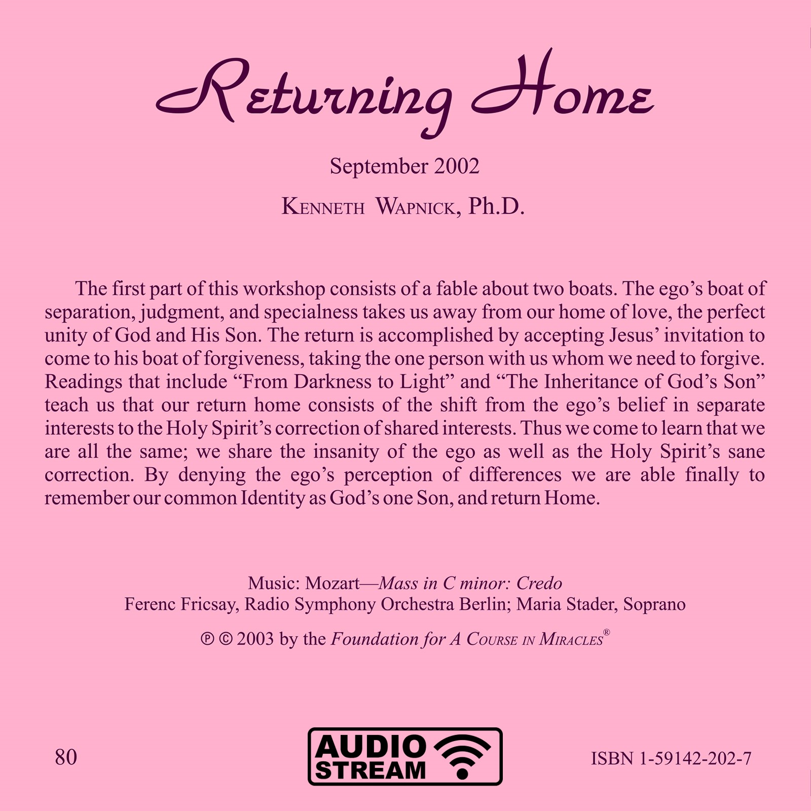 The first part of this workshop consists of a fable about two boats. The ego’s boat of separation, judgment, and specialness takes us away from our home of love, the perfect unity of God and His Son. The return is accomplished by accepting Jesus’ invitation to come to his boat of forgiveness, taking the one person with us whom we need to forgive. Readings that include “From Darkness to Light” and “The Inheritance of God’s Son” teach us that our return home consists of the shift from the ego’s belief in separate interests to the Holy Spirit’s correction of shared interests. Thus we come to learn that we are all the same; we share the insanity of the ego as well as the Holy Spirit’s sane correction. By denying the ego’s perception of differences we are able finally to remember our common Identity as God’s one Son, and return Home.