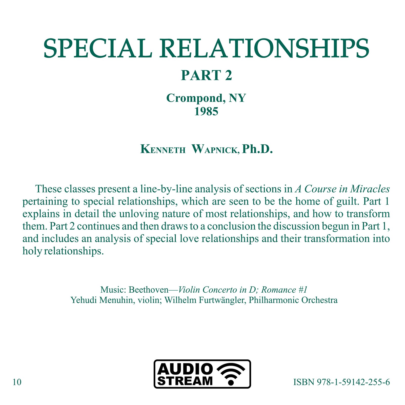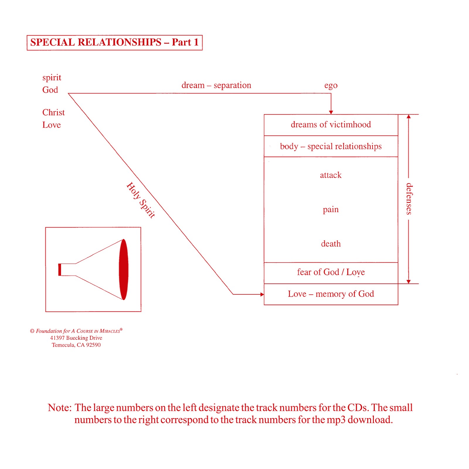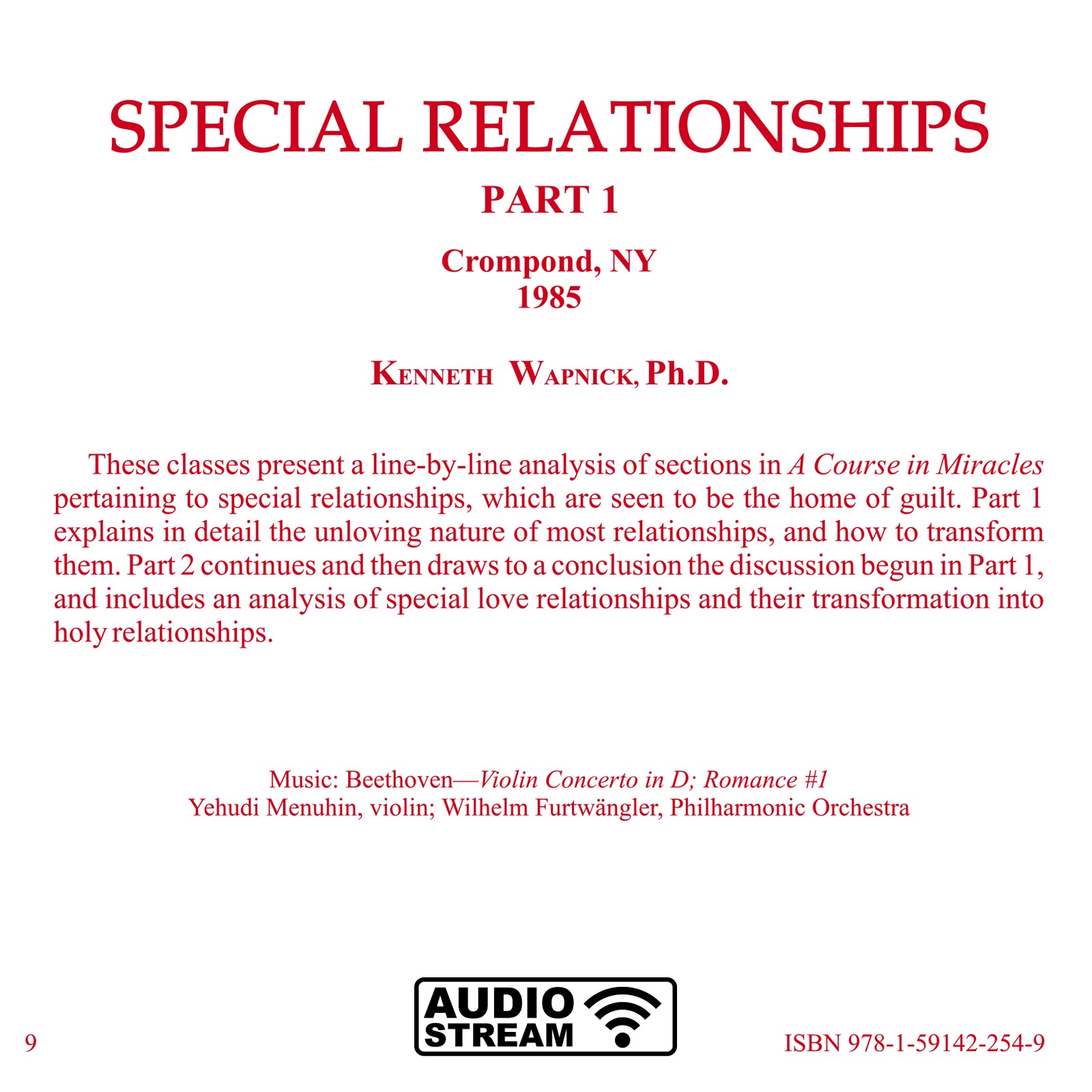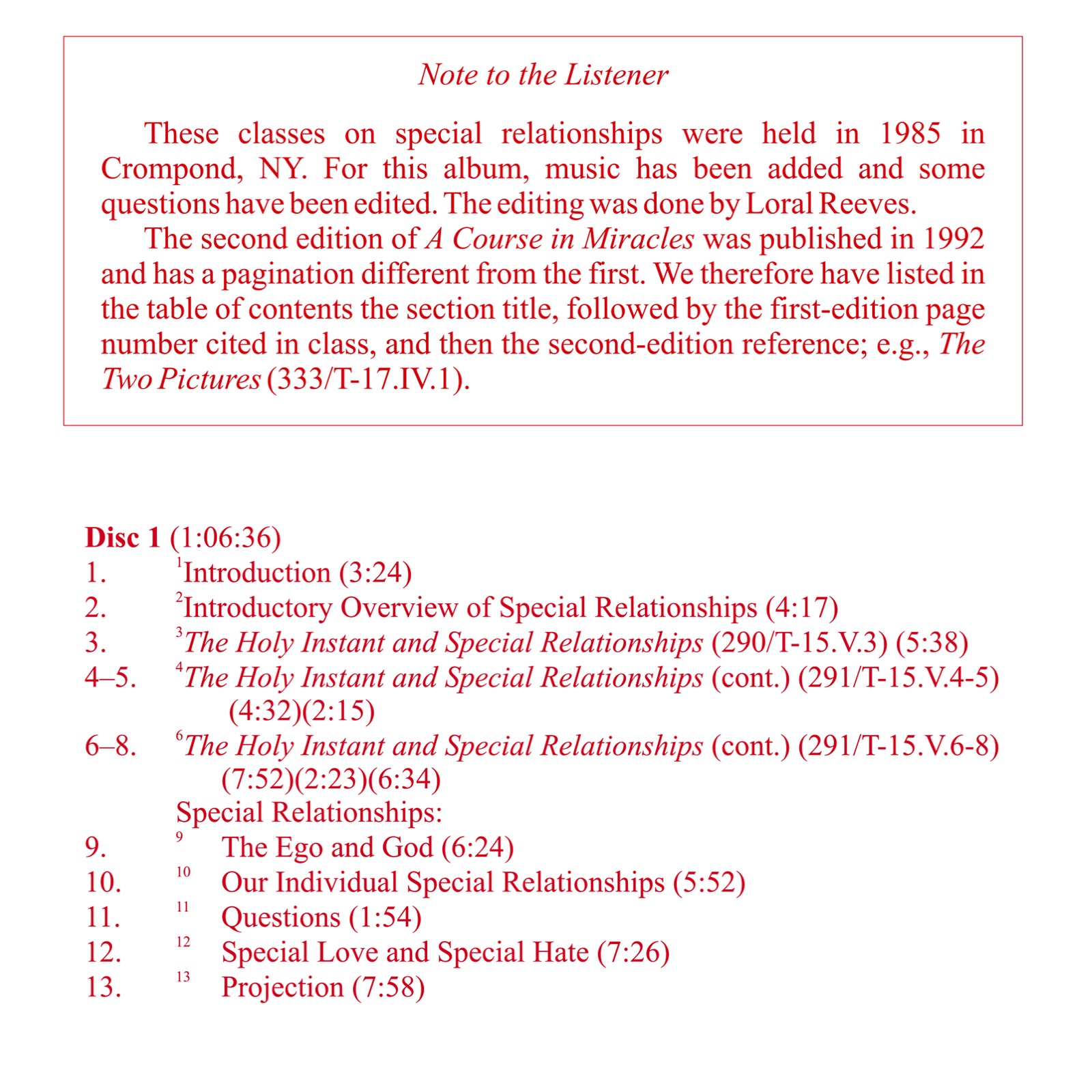 These classes present a line-by-line analysis of sections in A Course in Miracles pertaining to special relationships, which are seen to be the home of guilt. Part 1 explains in detail the unloving nature of most relationships, and how to transform them. Part 2 continues and then draws to a conclusion the discussion begun in Part 1, and includes an analysis of special love relationships and their transformation into holy relationships.