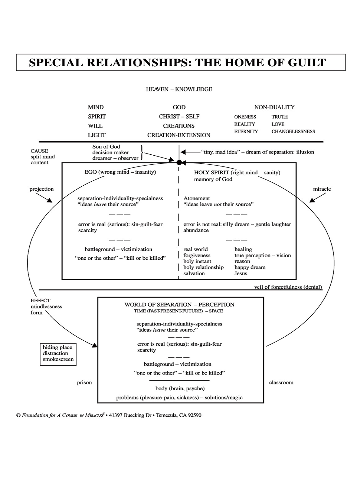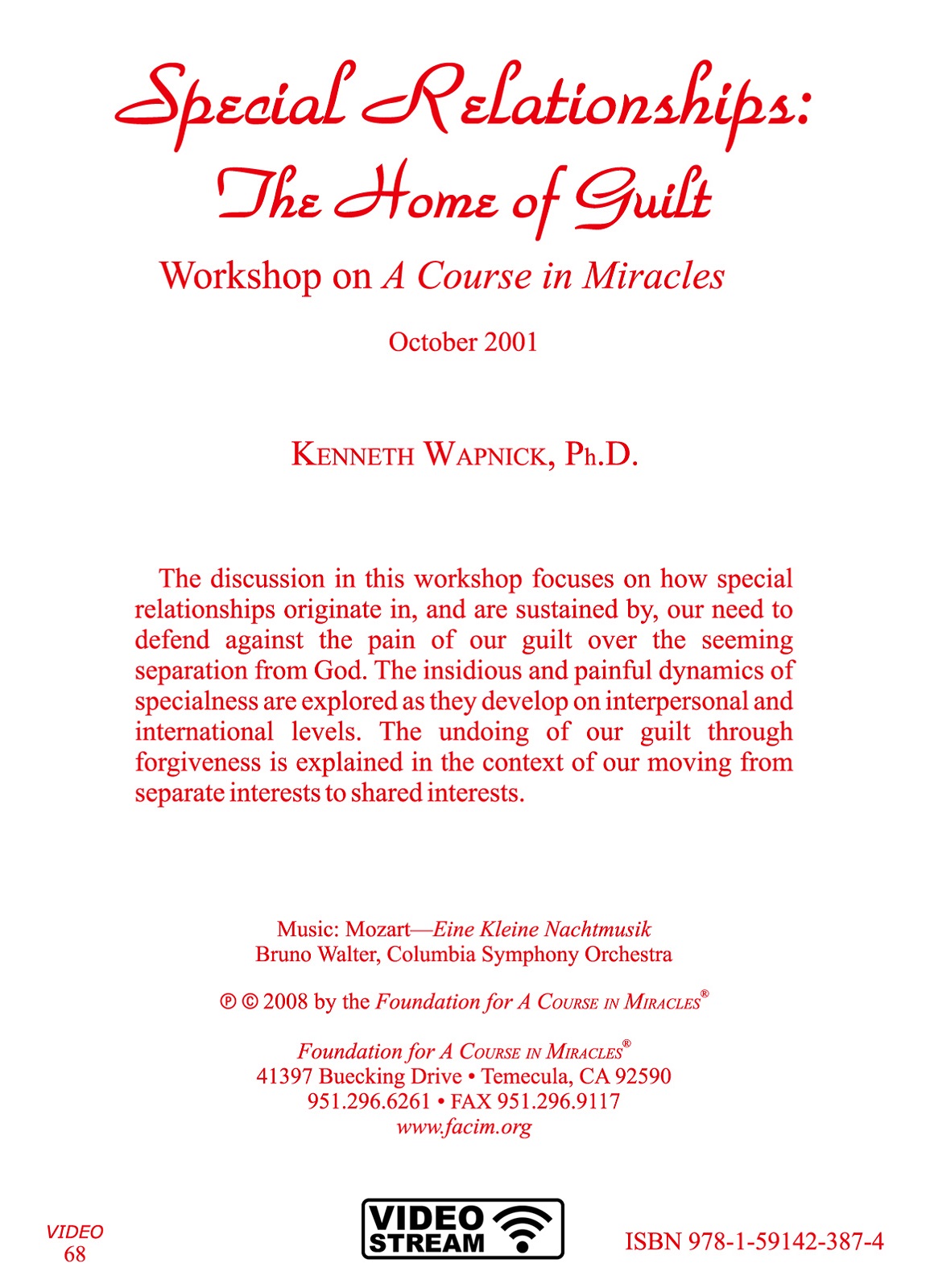 The discussion in this workshop focuses on how special relationships originate in, and are sustained by, our need to defend against the pain of our guilt over the seeming separation from God. The insidious and painful dynamics of specialness are explored as they develop on interpersonal and international levels. The undoing of our guilt through forgiveness is explained in the context of our moving from separate interests to shared interests.