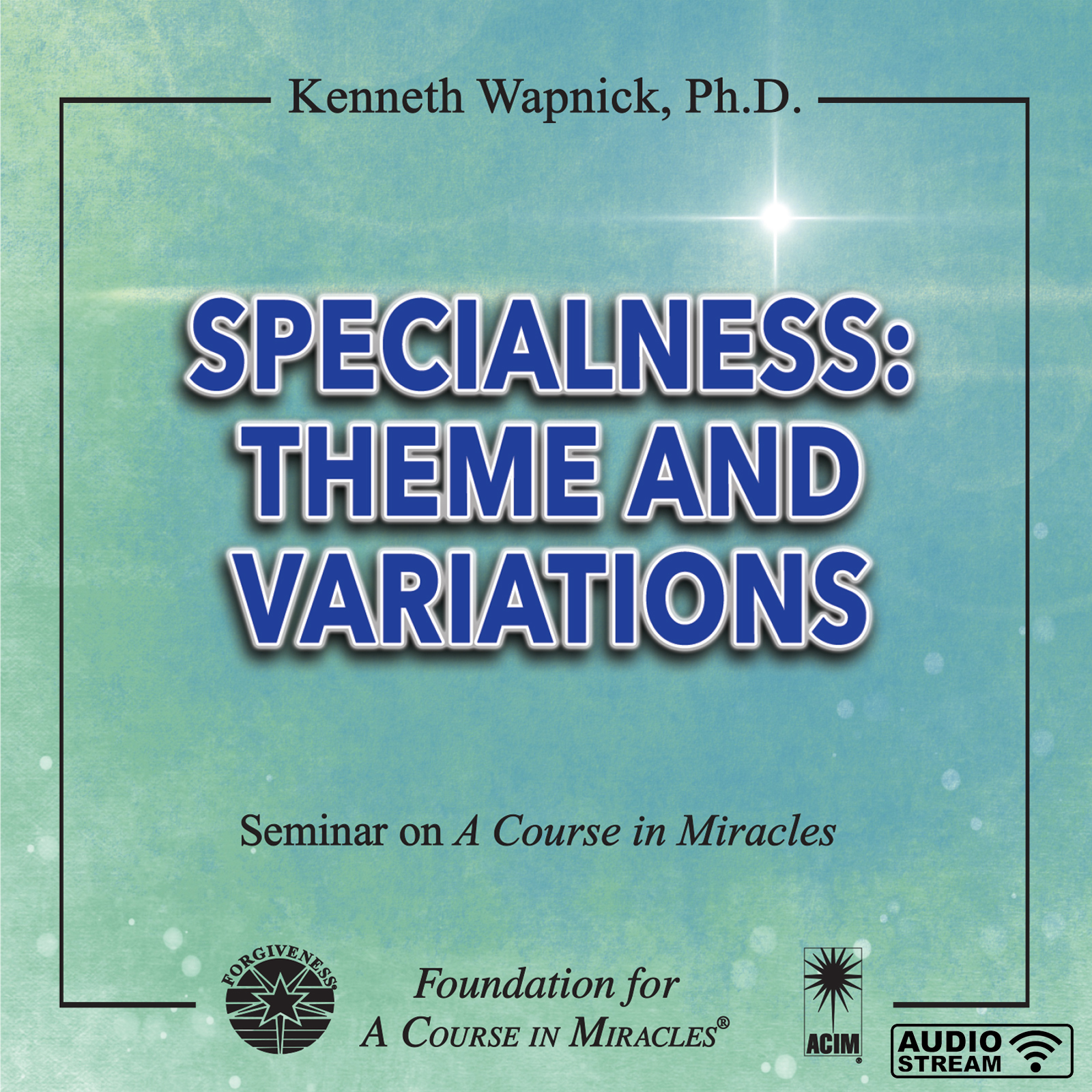 This 2010 seminar explores the theme of specialness, what it is, and how it is treated in the Course. Specialness and special relationships pervade absolutely every area of our lives. Underlying all special relationships is the belief that something is missing in us: that we have thrown away our innocence and destroyed the Love of God. The ego's way to escape the terror, anxiety, and pain of this inner lack is to fill this hole in our lives with special love and special hate relationships. These come in various shapes and sizes—variations on the theme of specialness. Understanding specialness is essential to understanding how the ego works. Without that understanding, there is no way we can ask the right question of the Holy Spirit or Jesus to help us remember that we are minds, not bodies, that can choose again.