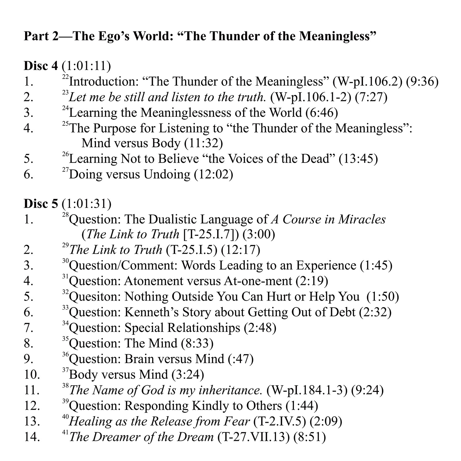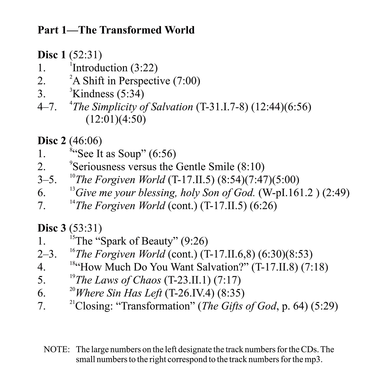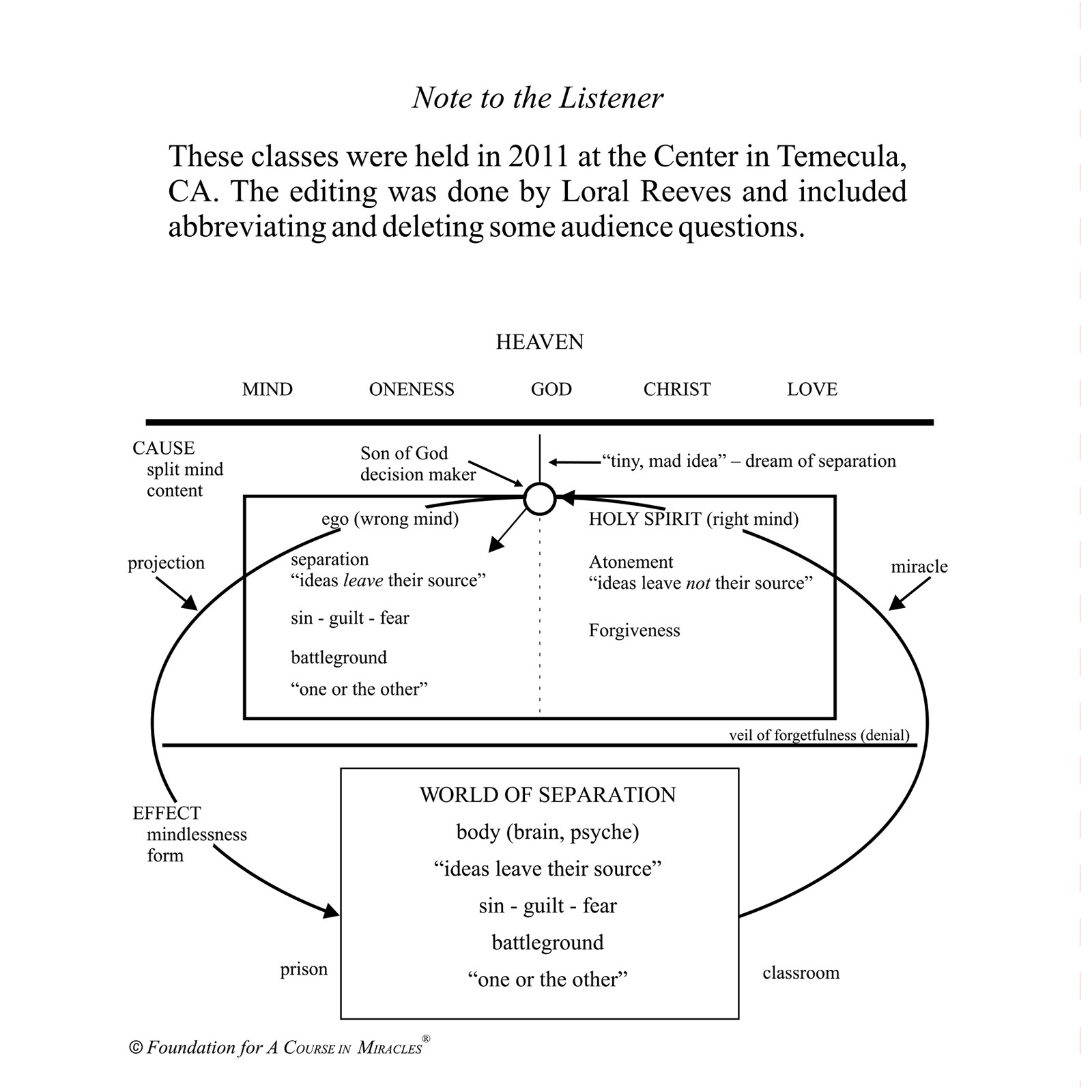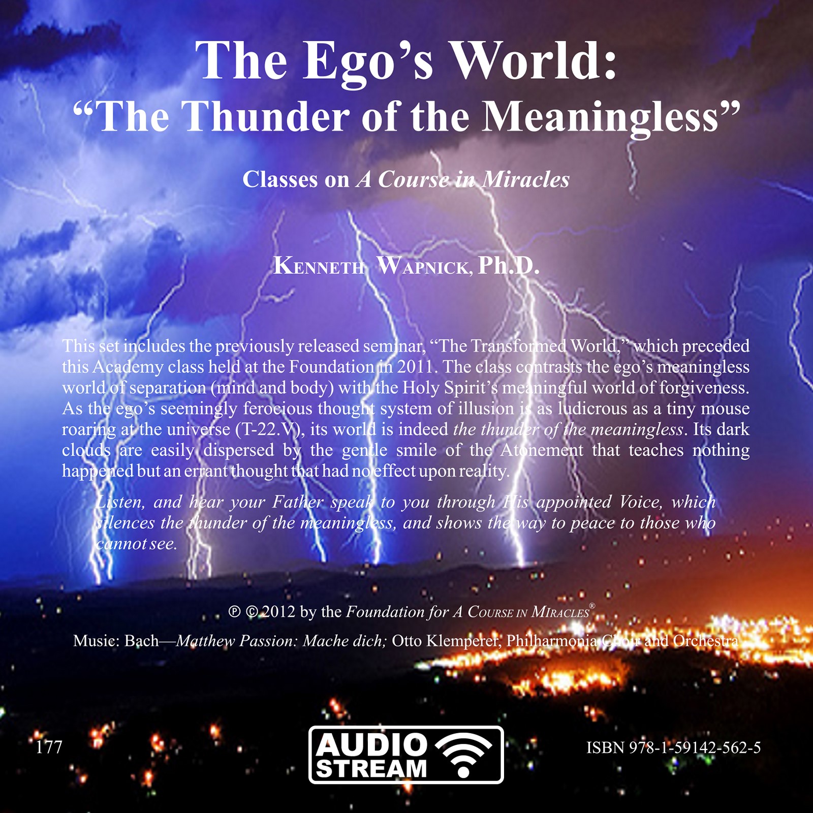 This set includes the previously released seminar, “The Transformed World,” which preceded this Academy class held at the Foundation in 2011. The class contrasts the ego’s meaningless world of separation (mind and body) with the Holy Spirit’s meaningful world of forgiveness. As the ego’s seemingly ferocious thought system of illusion is as ludicrous as a tiny mouse roaring at the universe (T-22.V), its world is indeed the thunder of the meaningless. Its dark clouds are easily dispersed by the gentle smile of the Atonement that teaches nothing happened but an errant thought that had no effect upon reality.