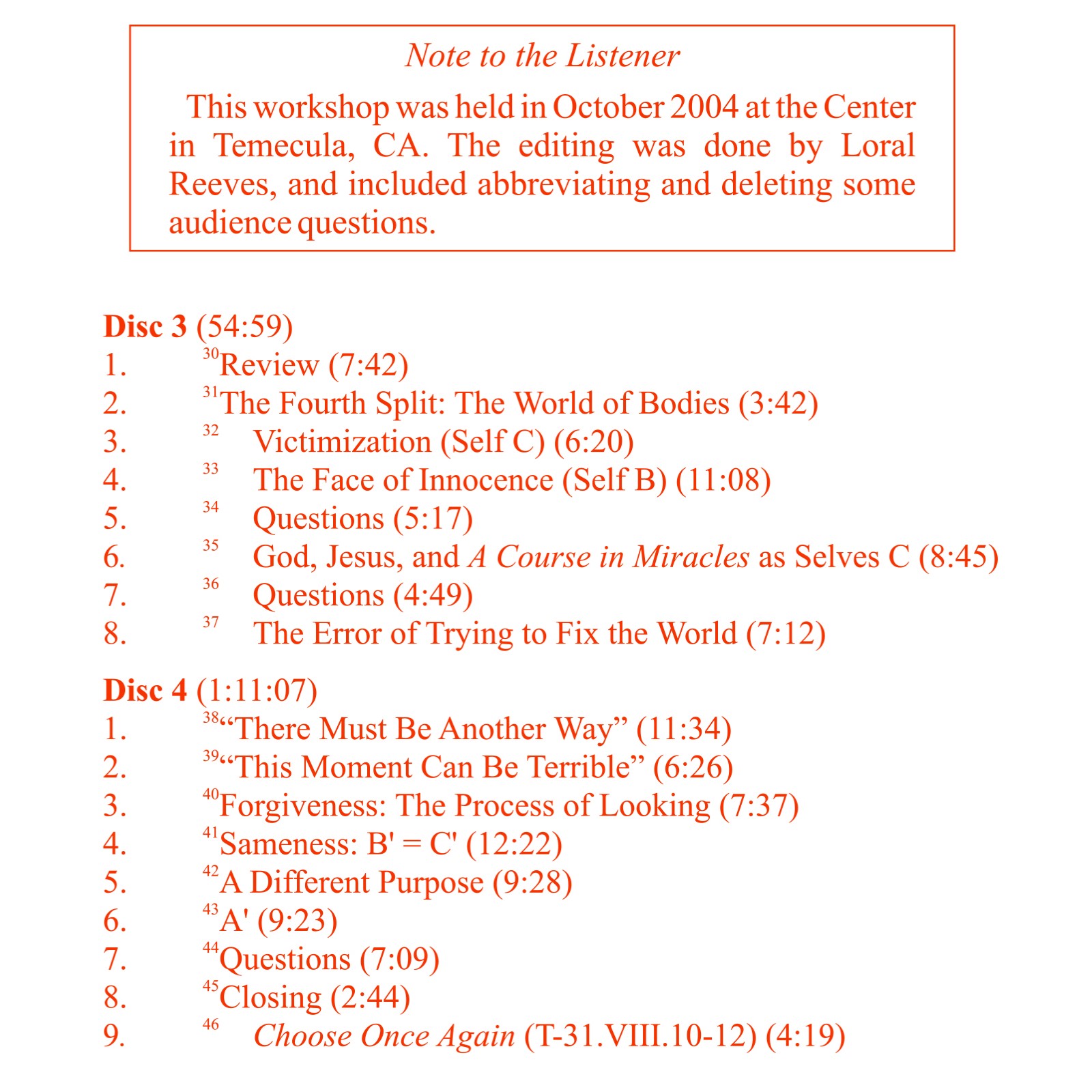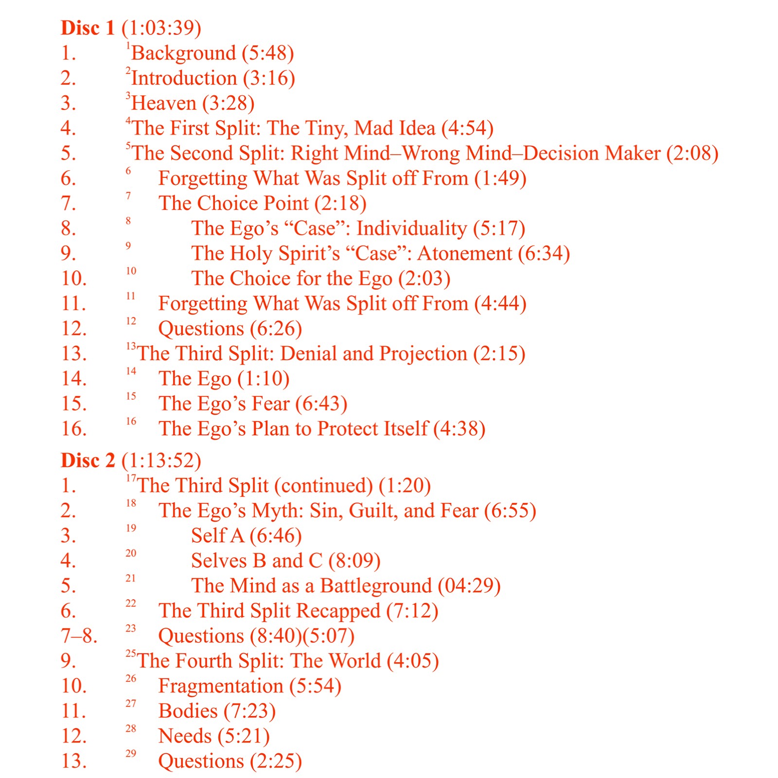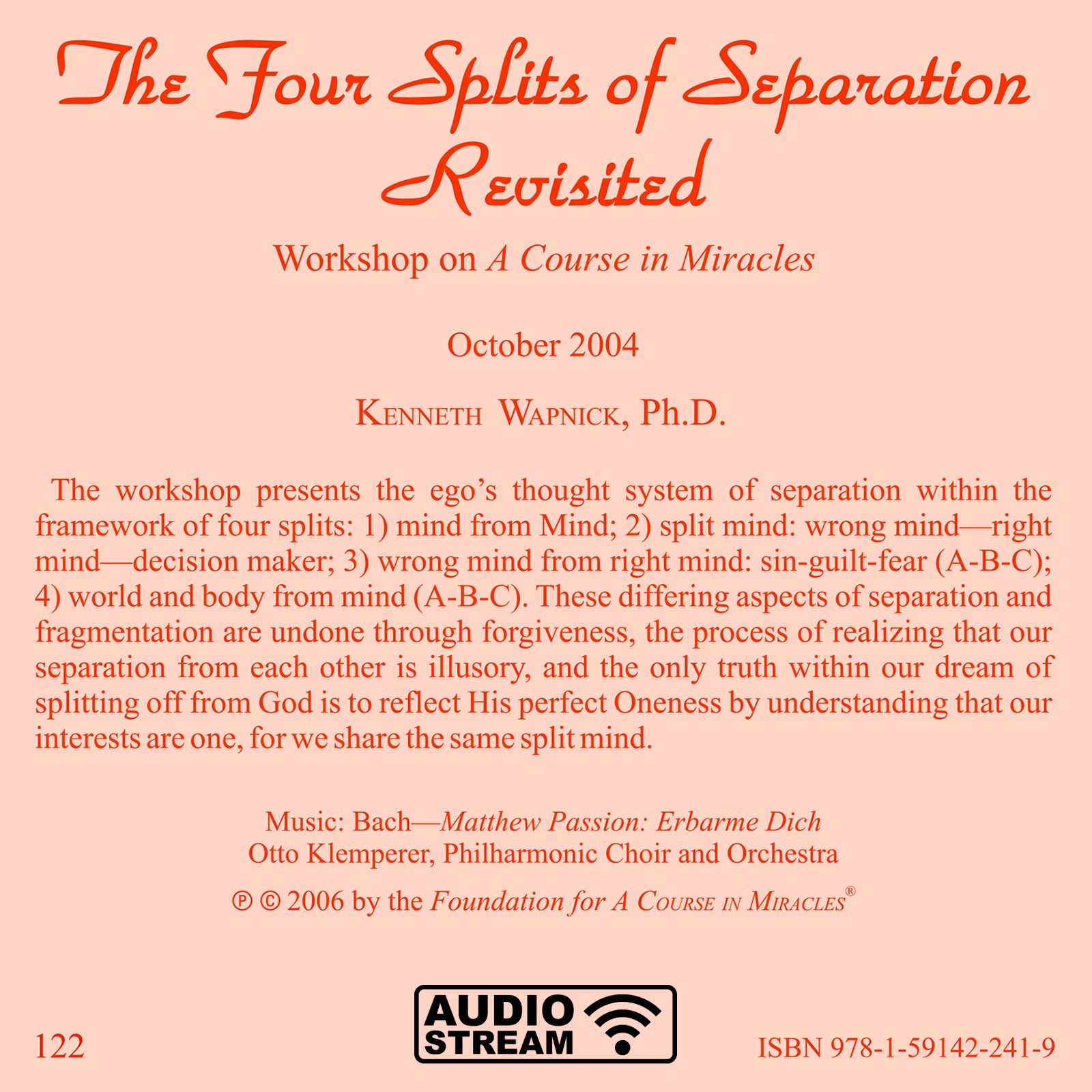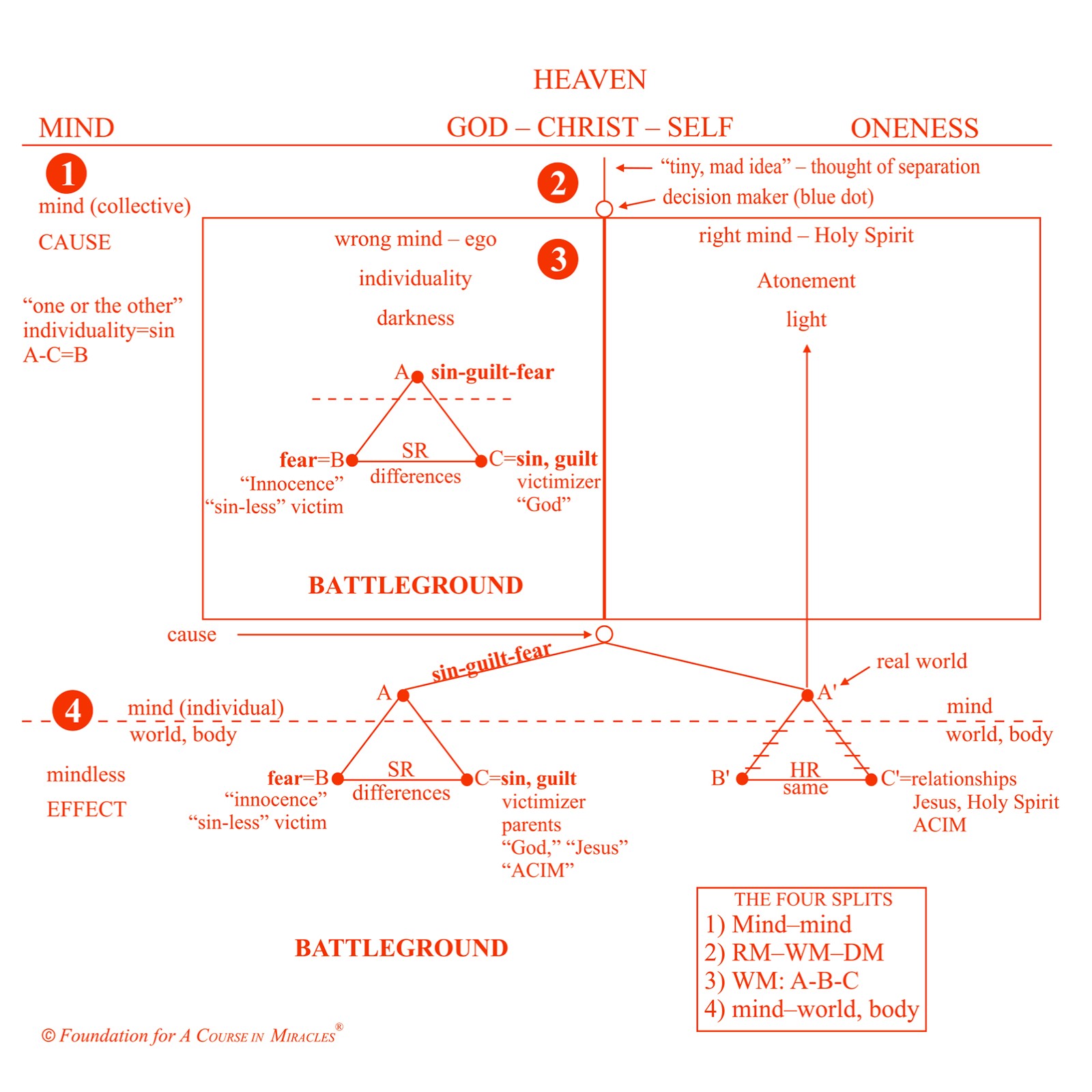 The workshop presents the ego’s thought system of separation within the framework of four splits: 1) mind from Mind; 2) split mind: wrong mind—right mind—decision maker; 3) wrong mind from right mind: sin-guilt-fear (A-B-C); 4) world and body from mind (A-B-C). These differing aspects of separation and fragmentation are undone through forgiveness, the process of realizing that our separation from each other is illusory, and the only truth within our dream of splitting off from God is to reflect His perfect Oneness by understanding that our interests are one, for we share the same split mind.