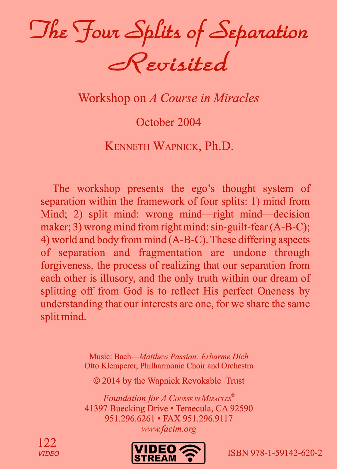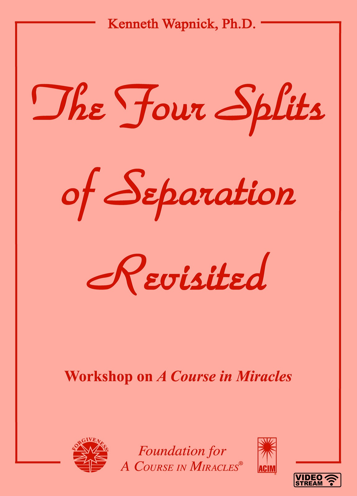 The workshop presents the ego's thought system of separation within the framework of four splits: 1) mind from Mind; 2) split mind: wrong mind—right mind—decision maker; 3) wrong mind from right mind: sin-guilt-fear (A-B-C); 4) world and body from mind (A-B-C). These differing aspects of separation and fragmentation are undone through forgiveness, the process of realizing that our separation from each other is illusory, and the only truth within our dream of splitting off from God is to reflect His perfect Oneness by understanding that our interests are one, for we share the same split mind.