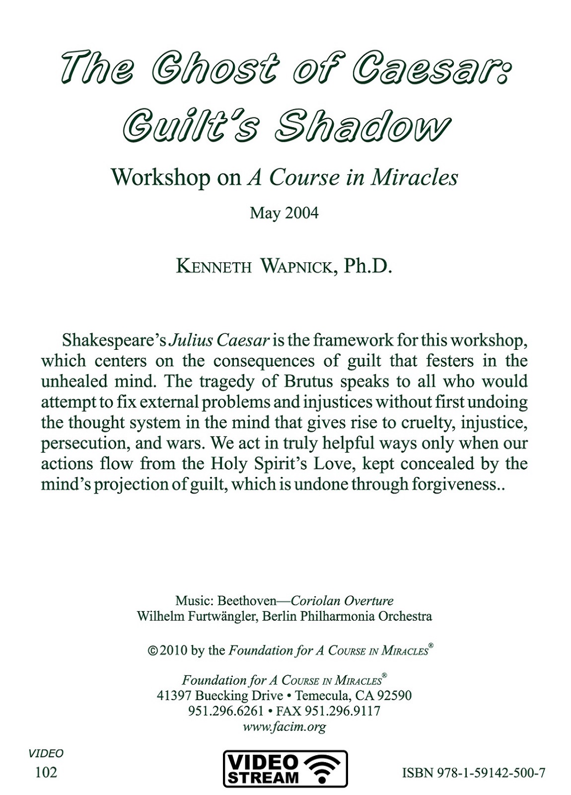 Shakespeare's Julius Caesar is the framework for this workshop, which centers on the consequences of guilt that festers in the unhealed mind. The tragedy of Brutus speaks to all who would attempt to fix external problems and injustices without first undoing the thought system in the mind that gives rise to cruelty, injustice, persecution, and wars. We act in truly helpful ways only when our actions flow from the Holy Spirit's Love, kept concealed by the mind's projection of guilt, which is undone through forgiveness.