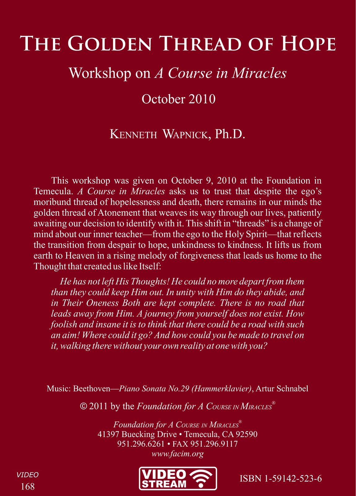 This workshop was given on October 9, 2010, at the Foundation in Temecula. A Course in Miracles asks us to trust that despite the ego’s moribund thread of hopelessness and death, there remains in our minds the golden thread of Atonement that weaves its way through our lives, patiently awaiting our decision to identify with it. This shift in “threads” is a change of mind about our inner teacher—from the ego to the Holy Spirit—that reflects the transition from despair to hope, unkindness to kindness. It lifts us from earth to Heaven in a rising melody of forgiveness that leads us home to the Thought that created us like Itself: