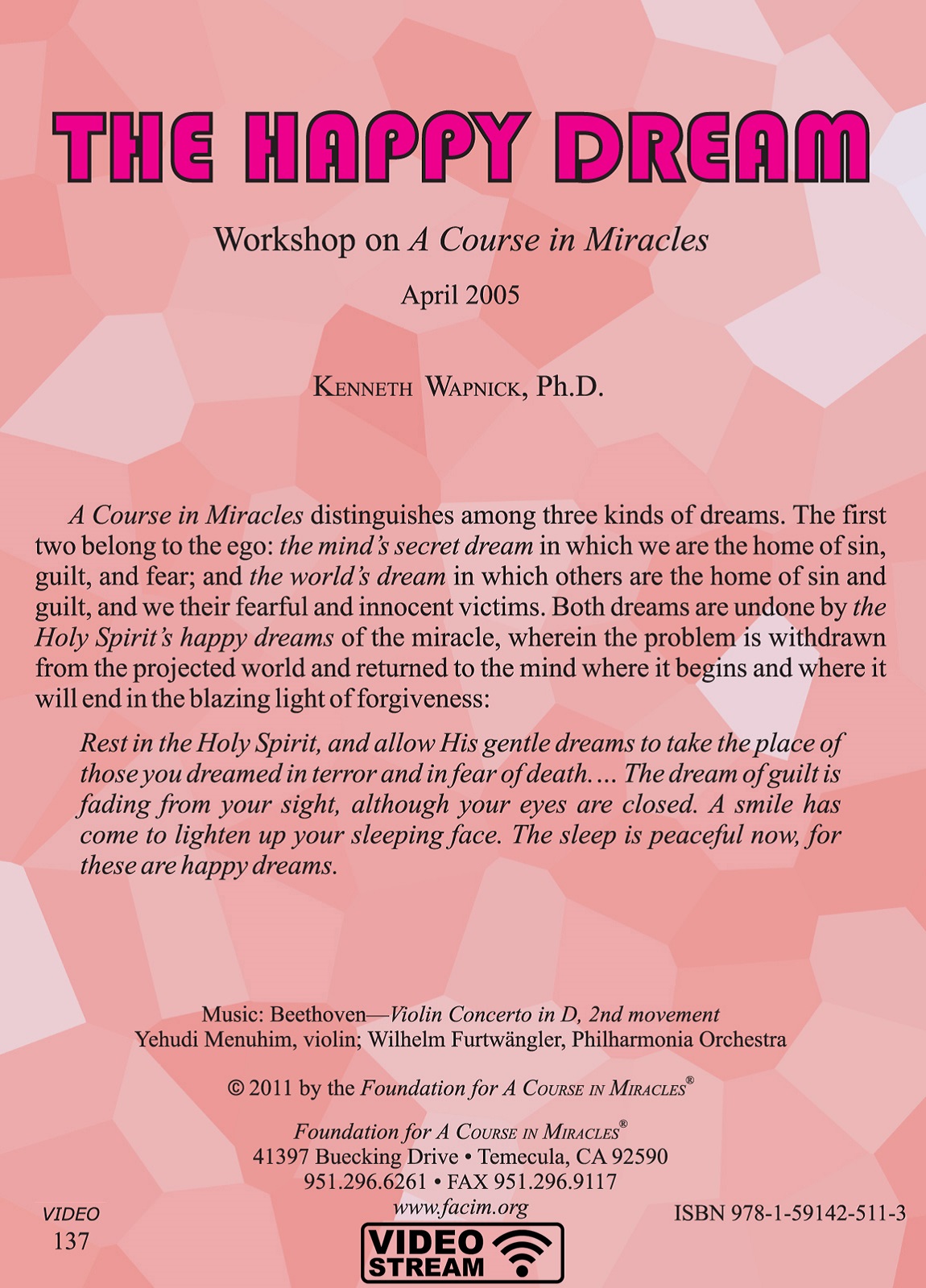 A Course in Miracles distinguishes among three kinds of dreams. The first two belong to the ego: the mind’s secret dream in which we are the home of sin, guilt, and fear; and the world’s dream in which others are the home of sin and guilt, and we their fearful and innocent victims. Both dreams are undone by the Holy Spirit’s happy dreams of the miracle, wherein the problem is withdrawn from the projected world and returned to the mind where it begins and where it will end in the blazing light of forgiveness: