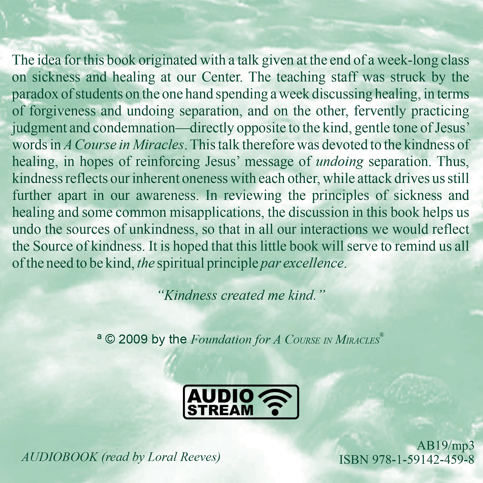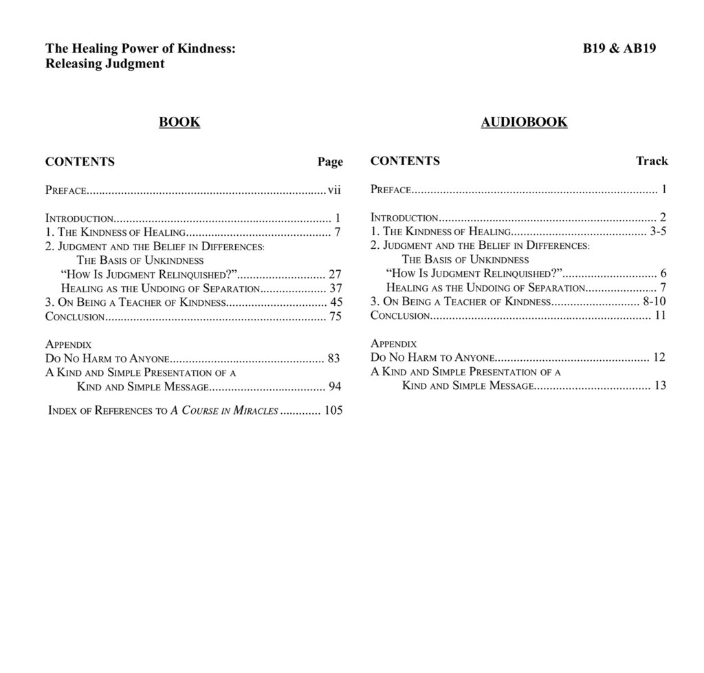 The idea for this book originated with a talk given at the end of a week-long class on sickness and healing at our Center. The teaching staff was struck by the paradox of students on the one hand spending a week discussing healing, in terms of forgiveness and undoing separation, and on the other, fervently practicing judgment and condemnation of each other, directly opposite to the kind, gentle tone of Jesus’ words in A Course in Miracles. This talk thus was devoted to the kindness of healing, in hopes of reinforcing Jesus’ message of undoing separation. Kindness reflects our inherent oneness with each other, while attack drives us still further apart in our awareness. In reviewing the principles of sickness and healing and some common misapplications, the discussion in this book helps us undo the sources of unkindness, so that in all our interactions we would reflect the Source of kindness. It is hoped that this little book will serve to remind us all of the need to be kind, the spiritual principle par excellence.
