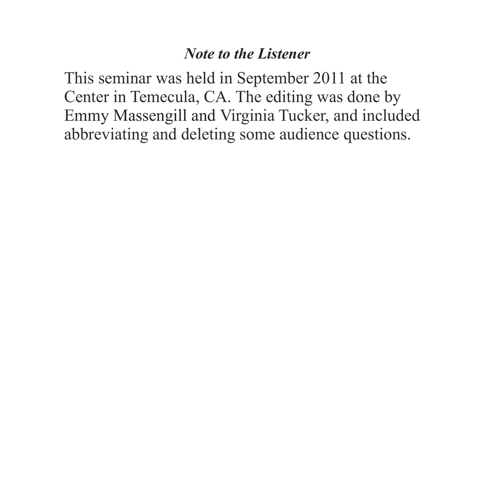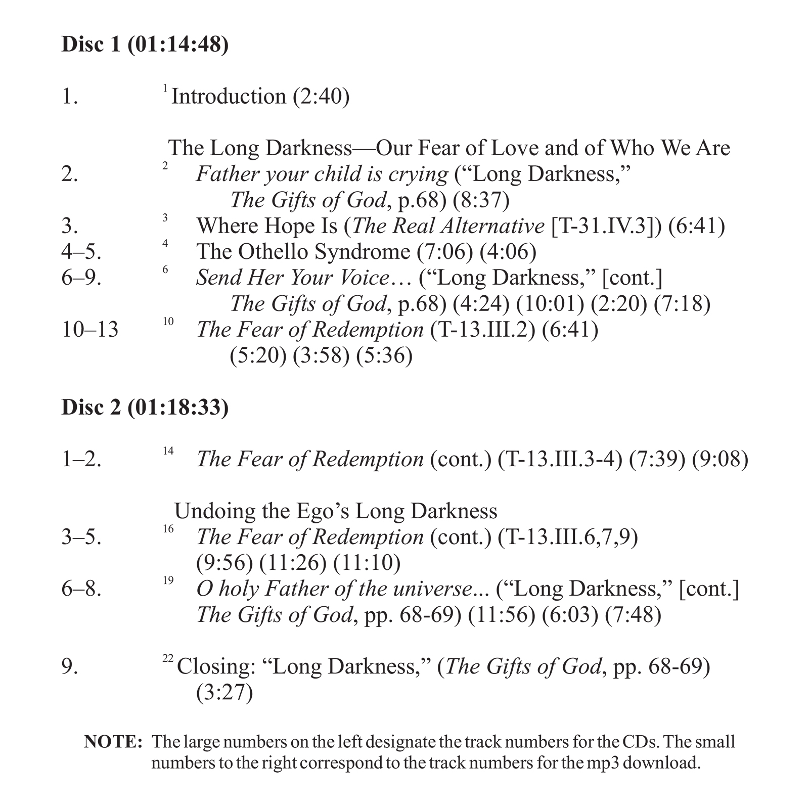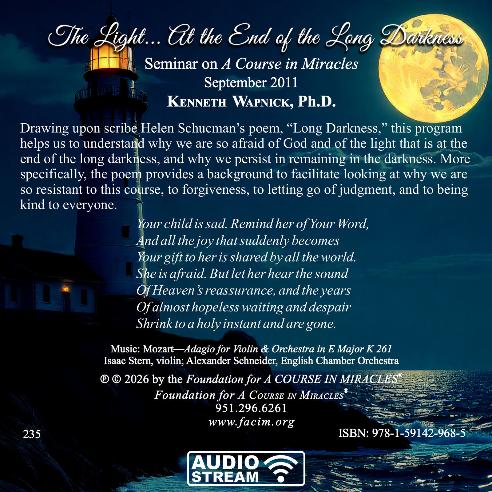 Drawing upon Course scribe Helen Schucman’s poem, “Long Darkness,” this program helps us to understand why we are so afraid of God and of the light that is at the end of the long darkness, and why we persist in remaining in the darkness. More specifically, the poem provides a background to facilitate looking at why we are so resistant to this course, to forgiveness, to letting go of judgment, and to being kind to everyone.